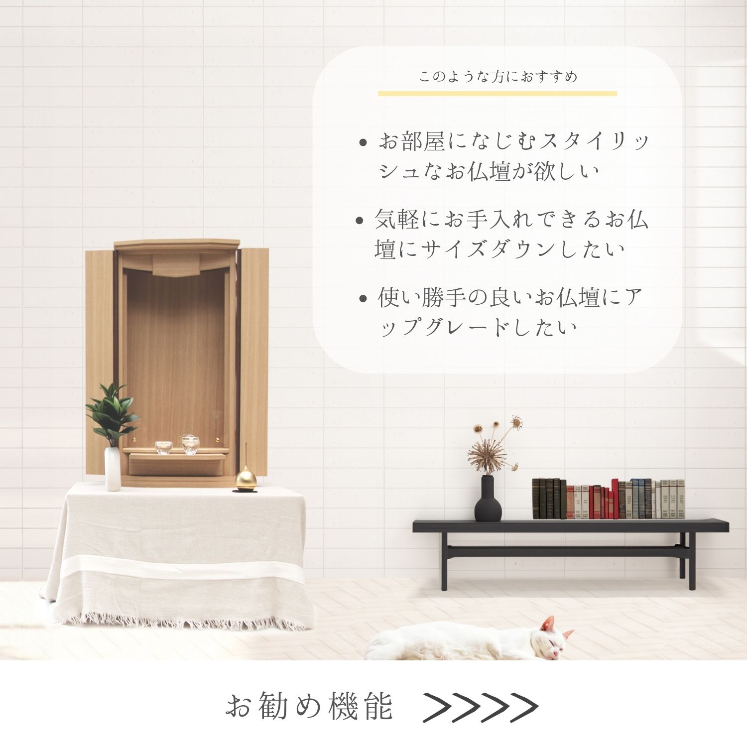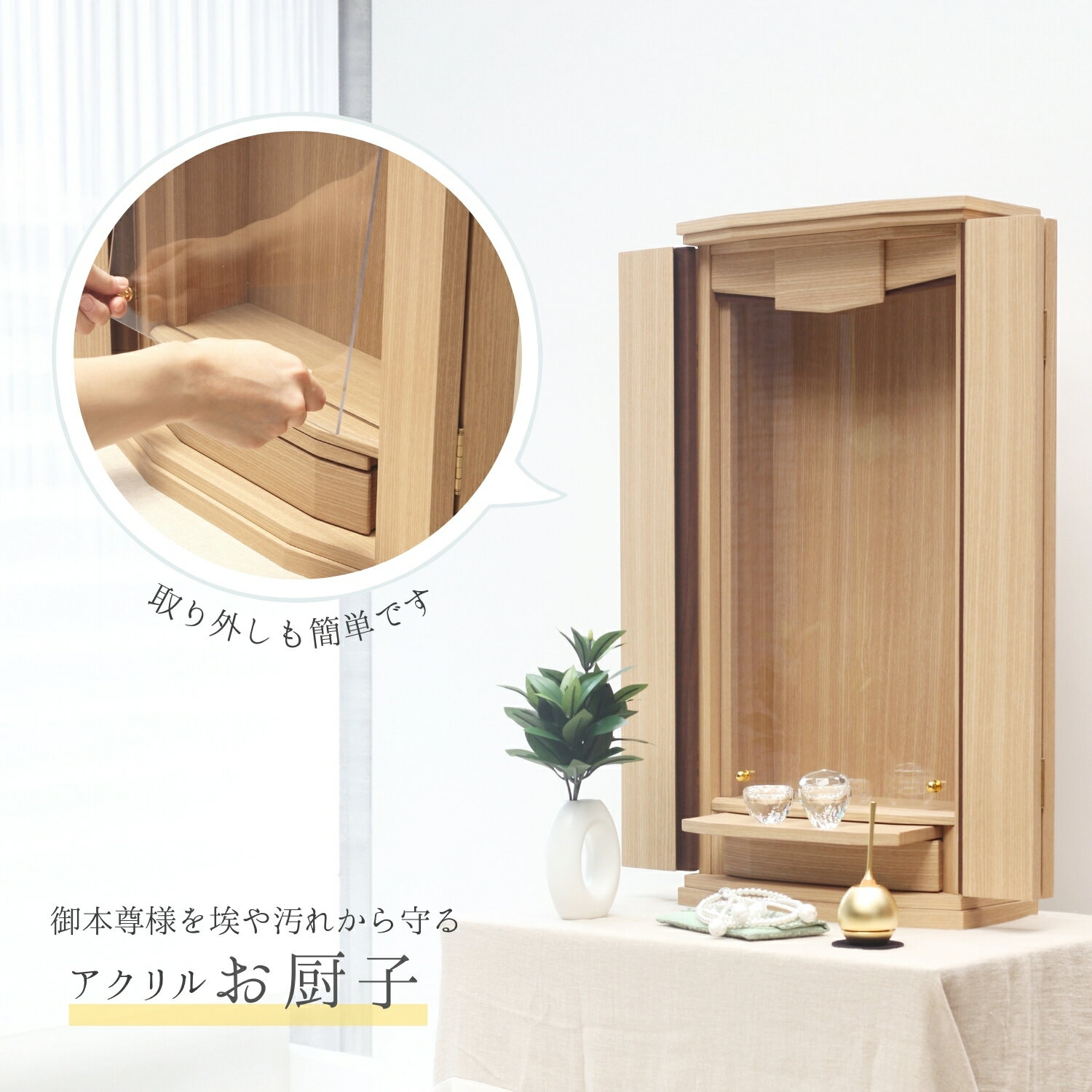 【おすすめポイント】 LEDライト / アクリル板 / 膳引き / 引き出し / 撥水加工 / 特装御本尊様対応 \ 創価学会 ナチュラルモダン仏壇 / 洗練されたデザインと使い勝手の良さを両立した、シンプルな上置き仏壇です。 膳引きや小物が収納できる引出もあり、使い勝手の良さも抜群。 表面には、撥水効果のある国産高級化粧紙を使用し、日々のお手入れも簡単です。 LEDライトは、手元の点灯スイッチでON/OFFが可能。ご本尊様を明るく照らします。 お厨子部分にはアクリル板付きで、御本尊様を埃や汚れからお守りします。 ※こちらは、特別御形木(特装)御本尊様対応商品です。 ・本体サイズ:W34cm×H68cm×D15cm ・表面材質: 日本製化粧紙 【ご注意】 お使いのモニターの発色具合によって、実際のものと色が異なる場合がございます。 また、お客様都合の返品交換はお受けできませんので予めご了承ください。【素材について】 お使いのモニターの発色具合によって、実際のものと色が異なる場合がございます。 また、お客様都合の返品交換はお受けできませんので予めご了承ください。 【配送方法】 宅急便(ヤマト運輸)で発送します。日時指定ができます。