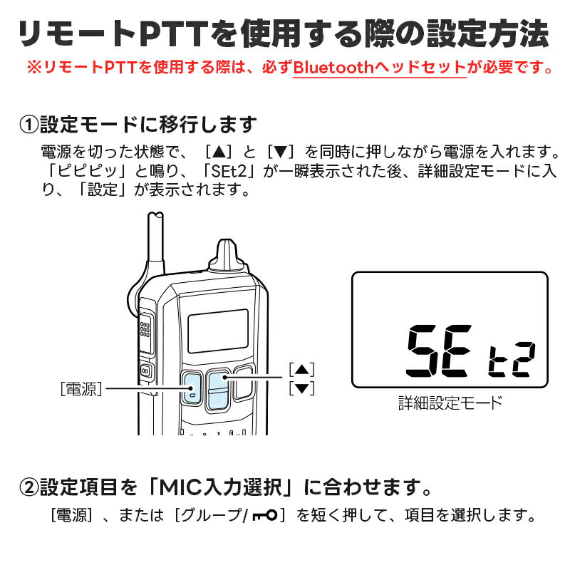 【商品説明】 免許・資格不要だから、誰でも買ってすぐに使用可能 IC-4120は、免許・資格不要で使える特定小電力トランシーバー。 購入してすぐに使える手軽なコミュニケーションツールです。 従来機IC-4110のオプションのほとんどを流用可能 従来機IC-4110/IC-4110Dのほとんどのオプションを流用可能。 これまでIC-4110/IC-4110Dをお使いいただいている方には、使い勝手はそのままにお使いいただけます。 また、買い替えコストを抑えることもできます。 屋外の仕事やレジャーでも安心して使える防塵・防水性能 水の飛沫に対する防水性能だけではなく、粉塵や砂などからの防護性能も備えているため、屋外や水回りでも安心してご使用いただけます。 一時音量切り替え機能 周りが騒がしく、聞き取りにくくなった時、ワンタッチであらかじめ設定したレベルまで音量を上げることができます。逆に、音量を下げる設定も可能です。 単3形アルカリ乾電池3本で約80時間の長時間運用が可能※ 単3形アルカリ乾電池3本で、約80時間※ のロング運用が可能です。また、繰り返し充電できるリチウムイオンバッテリーパックBP-258(オプション)では、最大23時間※ の運用ができます。 ※電池の使用時間は、受信1:送信1:待受8の割合で使用するときのものです。電池の種類(製造元など)によって異なります。また、HM-286L(別売品)使用時、およびBluetooth機能OFF時の運用時間です。 ワンタッチで通話相手を選べるサブチャンネルPTT機能 メインとサブチャンネル用PTTキーにより、それぞれに割り当てられた通信相手をワンタッチで選択することが可能。チャンネルの切り替え操作をすることなく、素早く通信相手を選ぶことができます。 LAN/LTE接続対応の中継装置IC-RP4130GWに対応 オプションの中継装置IC-RP4130GWを使用すれば、簡単に通話距離を約2倍に延ばすことができます。さらに、LAN接続により、大型店舗や施設、多層階のビルでも安定した通話が可能になります。さらに、LTE回線で全国規模※の通話ができる特小連携トランシーバーWithcall Biz®と通話することも可能です。 ※メーカーが提供するSIMで利用できるauのLTE回線のカバーエリアが通話範囲となります。 コンパクトに使える回転式アンテナ採用 狭い通話範囲で使う時は、アンテナを回転させ、コンパクトに使えます。胸元や腰に装着しても、体にアンテナが当たりにくくなり、スムーズな作業、移動が可能になります。 サイドキー割り当て機能 サイドキーに、下記の機能を割り当てることができます。よく使う機能に素早くアクセスできます。 ・サブチャンネルPTT ・お知らせボタン機能 ・録音再生機能 ・一時音量切り替え機能 お知らせボタン機能 接客中や電話中など、手が離せないシーンでも、あらかじめ録音しておいたメッセージ(10秒以内)を送信して、すぐに応答することができます。 クラス最高の音声出力400mW以上 BTL回路の採用により、クラス最高レベルとなる400mW以上の大音量を実現しました。また、大音量でもこもらないクリアで聴き取りやすい高音質を実現しています。 録音再生機能 通信内容を録音/再生することができるので、重要な連絡や情報を聞き直し、再確認することができます。 ※録音は1回の通信(送受信)で10秒まで 「セルフィールR」による抗菌・抗ウイルス加工 製品本体に、抗菌・抗ウイルスなどの優れた効果を発揮する「セルフィール®」を噴霧しています。「セルフィール®」は、環境に関わらず効果を発揮し、長期間に渡って作用し続けるとされる触媒で、病院や公共交通機関、教育機関などでも多く採用されています。 チャンネル非表示機能を搭載 チャンネル非表示機能を使えば、ディスプレイに使用チャンネルを表示させず、業務通信が行われているチャンネルを第三者からわかりにくくすることができます。 送信音モニター機能 手袋装着時など、PTTボタンを押しにくい状況下で、確実に送信できているか確認しながら通話することができる機能です。 グループ通信機能 38通りのトーンにより、通信相手を特定のスタッフに限定するグループ通信機能を搭載しています。 トーンバースト機能(グループ通信機能使用時) 送受信切り替え時の耳障りなノイズを抑制し、イヤホン併用時も、より快適に使用できます。 使用中のチャンネルを探すスキャン機能 通話が行われているチャンネルをスキャンできます。通話が行われているチャンネルを見つけるとスキャンを中断し、通話をモニターできます。 受信専用機能 工場見学の案内など、特定の人だけが話せるほうがよいときに便利な受信専用機能を搭載しています。 その他の機能 ・ベル設定機能 ・電池残量警告機能 ・ワンタッチPTT(通話スイッチ)機能 ・ビープ音オン/オフ ・パワーセーブ機能 ・断線検出機能 ・マイク感度・スケルチ調整 ・秘話機能 ・コンパンダ機能 ・VOX機能 ・LEDバックライト など【製品仕様】 周波数範囲 400MHz帯 送信出力 10mW/1mW(+20%~-50%) スピーカー出力 内部 400mW以上、外部 120mW以上 (8