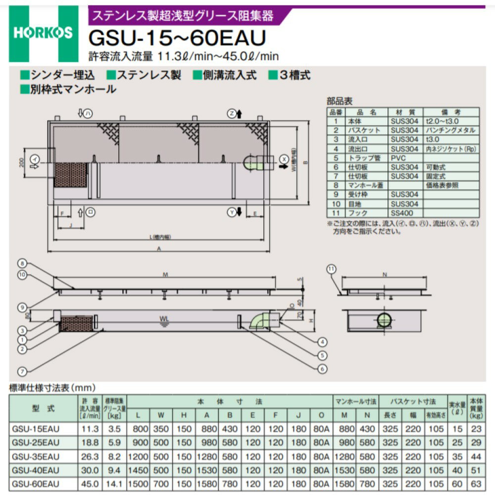 HORKOS ステンレス製超浅型グリース阻集器 シンダー埋込 側溝流入式 3槽式 別枠式マンホール ■GSU-35EAU+S 本体 SUS304 バスケット SUS304 パンチングメタル 受け枠 SUS304 マンホール蓋 ステンレス(T-0 人荷重) ※ご注文の際は、流入(イ・ロ・ハ)、流出(X・Y・Z)方向をご指示ください。 バスケット取っ手の位置も変わります。 増打コンクリート(シンダー)埋設用です。 厨房排水は直接側溝(ピット)から阻集器に流入します。 スラブの開口が不要です。 《施工手順》 1.スラブコンクリートへ防水を施行し、防水保護モルタルを打設してください。 2.流入方向及び流出方向を確認してください。 3.阻集器本体を据え付ける位置に均しコンクリートを打ちます。 4.レベル調整・芯だしを行います。 5.流出管の接続は、シール剤を使用し確実に行ってください。 6.シンダーコンクリートを打設します。 7.床仕上げを行います。 8.別枠式マンホールの場合は、受け枠を床仕上げレベルに合わせて設置します。 この際、床仕上げを行う前にマンホール蓋を受け枠に設置しマンホール蓋が容易に外せることを確認してください。 (受け枠がねじれている場合、マンホール蓋が収まらなかったり、取り外せなくなることがあります。) 9.かさ上げを施工する場合は、木枠等で固定しコンクリート圧により内側にたわまないようにしてください。 (バスケット、仕切板等が取り外せなくなることがあります。) ホーコス グリーストラップ グリストラップ 無荷重 ゼロ荷重