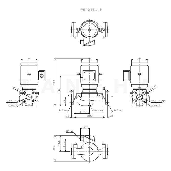 川本ポンプ 渦巻ポンプ PE(2) 形 Pラインポンプ ■PE406E1.5 60Hz 【用途】 冷温水循環用 一般工業用 機械セット用 【特長】 全閉モータ採用のため、ベアリング劣化や絶縁劣化に強く、優れた耐環境性。 不凍液対応のメカニカルシールにより、濡れに強く長寿命。 錆付きがなく、メンテナンスが容易。 【標準仕様】 揚液 液質 清水[pH5.8~8.6 固形物・濃度: 50mg/L以下、固形物・径: 0.3mm以下]、不凍液 液温 0~90℃(凍結なきこと) 材料 インペラ SCS13 主軸 SUS304(接液部) ケーシング FC モータ 種類 全閉外扇屋外形 電源 単相100V 三相200V・400V 同期回転速度 50Hz:3,000min-1 60Hz:3,600min-1 効率 0.75kW以上はプレミアム効率(IE3)※ 設置場所 屋内・屋外(周囲温度/湿度、0~40℃/90%RH以下) 構造 インペラ クローズ 軸封 メカニカルシール(SiC X カーボン) 軸受 密封玉軸受 相フランジ形状 専用フランジ(口径25mm以下)JIS10Kうす形(口径32mm以上) 塗装色(マンセルNo.) グレー(2.5PB5.1/0.8) ※60Hzの5.5kW品は高効率 KAWAMOTO PUMP 塵あい 結露 静穏設計 低騒音 メカ鳴き防止 ハイグレード塗装 ステンレスCentrifugal