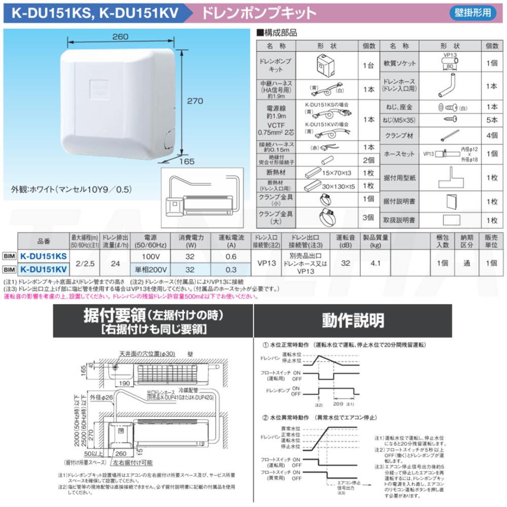 【地域に拠りあす楽 在庫あり】◎オーケー器材 K-DU151KS 揚程2/2.5m(50/60Hz) 100V : ドレンポンプキット(梁越横引可)(壁掛)∴O.K.KIZAI ダイキン DAIKIN