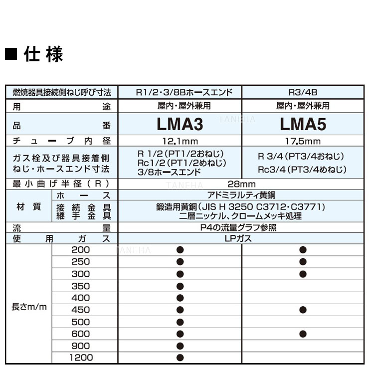 三菱伸銅 金属フレキシブルホース(タマフレックス) LMA3W-Bタイプ (LMA3-B) 【用 途】 燃焼器具接続 低圧部の配管材 屋内・屋外兼用 【注 意】 取付け前には、製品に添付されている「金属フレキシブルホース TAMA FLEX®取付け説明書」を必ずご覧の上、正しくご使用ください。 取付けは液化石油ガス設備士の有資格者が施工してください。 LPガス用TAMA FLEX®を都市ガス用には使用しないでください。 接続は必ずTAMA FLEX®純正金具をご使用ください。それ以外の金具は漏れの原因となりますのでご使用しないでください。 ガステーブル、万能焼器、卓上コンロ/グリル、ガス炊飯器、ガスストーブなど、移動式または固定式でも振動のある燃焼器具には、絶対に取り付けないでください。ホースが金属疲労により割れて「ガス漏れ」の原因になり危険です。詳細はカタログでご確認ください。 ※ 使用上の注意事項や商品の詳細については、メーカー公式サイトをご覧いただくか、メーカーに直接お問い合わせいただき、ご購入前に今一度ご確認をお願い致します。 プロパンガス