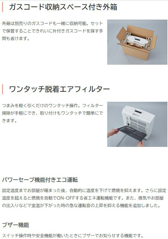 パワフルな暖房能力で広いお部屋も一台で快適 スノーホワイト(W5) 12A・13A・LPG 注意! PA13Aには対応しておりません。 暖房能力:5.81kW〜1.05kW 外形寸法:W520×D175(脚部180)×H448mm 質量:8.7kg 消費電力 運転時(強:17W/弱:10W) 暖房のめやす ガス質13Aの場合 木造15畳まで コンクリート21畳まで スポット暖房 パワーセーブ機能付きエコ運転 おやすみ運転 おはよう運転 3・5・8時間消し忘れタイマー 操作ロック フィルター掃除サイン ブザー機能 別売りのガスコード1m-3m-5m (0708081/0708082/0708083) メーカーHPにて詳細を確認ください