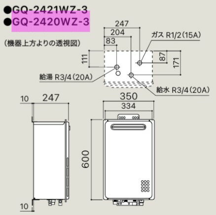 型番GQ-2421WZ-3 燃料種別13A 用途業務用 給湯能力24号(4〜5人家族向き) 給湯タイプ給湯専用 外装鋼板 設置タイプ壁掛型 寸法給湯器本体 :幅350×高さ600×奥行247(mm)