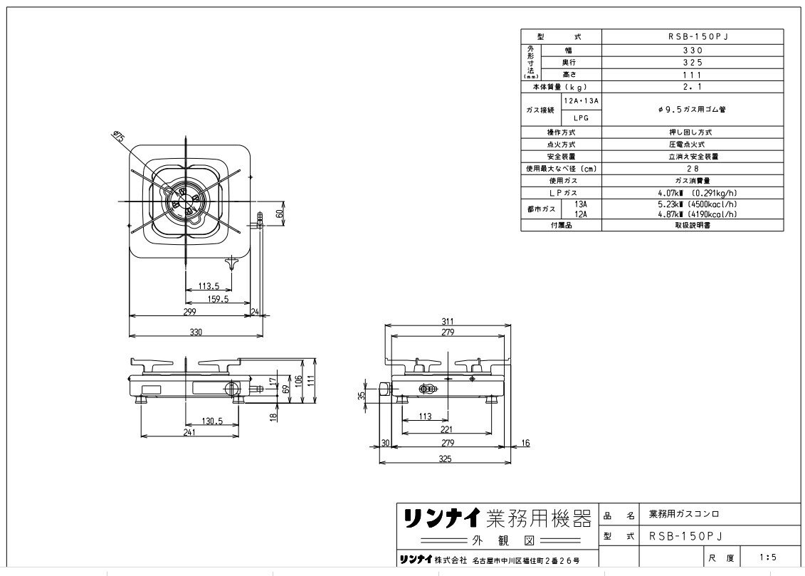 業務用ガスコンロ 外 形 寸 法 W × D × H ( ) 330×325×111 質 量 ( ) 2.1 器 具 栓 方 式 閉止式 操 作 方 法 回転式 点 火 方 式 圧電点火方式 立 消 え 安 全 装 置 熱電対式 特長 (1)5.23kW(4500kcal/h)の強火力バーナー (2)立消え安全装置を搭載 (3)3段階の絞りポジション付 (4)売価11,800円の低価格 (5)圧電点火方式 (6)ガス種限定 LPG、12A・13Aのガス種限定生産です。