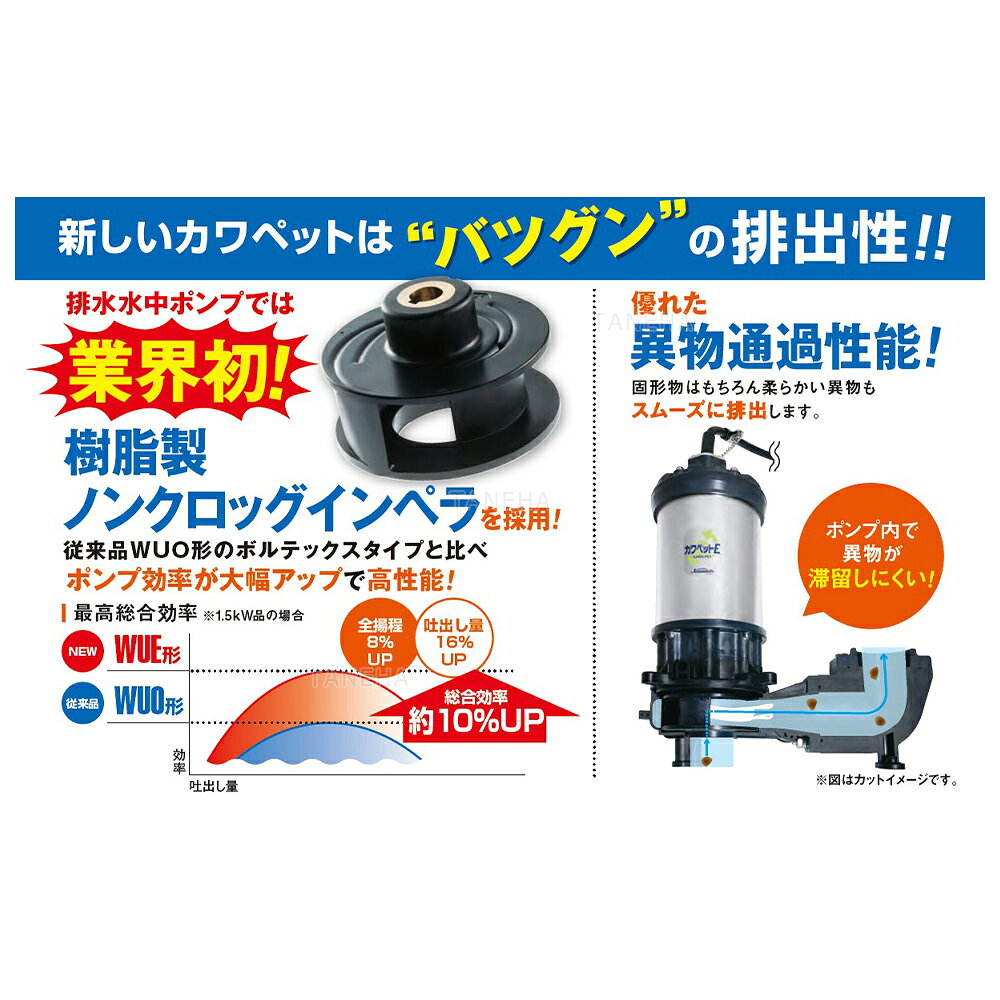 川本ポンプ カワペット®シリーズ強化樹脂製汚水・汚物水中ポンプ WUE形 カワペット®E 【用途】 汚水・汚物・湧水の排水用・ピット排水用・雑排水用・浄化槽排水用 【特長】 業界初。樹脂製ノンクロッグインペラを採用。従来機種より水量範囲が広がり、更に異物排出性も向上。 ポンプ部は樹脂、モータ部はステンレス製フレームで腐食に強く、軽くて取扱いも容易。 L(自動)・LN(自動交互)タイプはフロートスイッチの調整が可能。 自動交互内蔵型は自動型と組合せて、制御盤なしで自動交互運転、または異常増水時に並列運転を行います。 万一、一方のポンプが故障しても他方のポンプが単独運転を行います。 (一社)公共建築協会の水中モーターポンプ(汚水用・雑排水用)評価品です。(WUE806-2.2を除く) 【標準仕様】 液質 汚水・汚物水0〜40℃ pH5〜9 材料 インペラ:樹脂主軸:SUS304(接液部)ケーシング:樹脂 モータ 乾式水中モータ三相200V、400V同期回転速度 50Hz:3,000mim-1、60Hz:3,600min-1 異物通過径(mm)※ 口径 異物(球)の径50 3565 3580 40 ※ 商品の詳細や、使用上の注意・警告事項等については、メーカー公式サイト(カタログ)をご覧いただくか、メーカーに直接お問い合わせいただき、ご購入前に今一度ご確認をお願い致します。 KAWAMOTO PUMP 川ポン 高性能インペラ 50hz 60hz 長寿命 無接点リレー 温度上昇防止オートカット 二重軸封構造 ダブルメカニカルシール