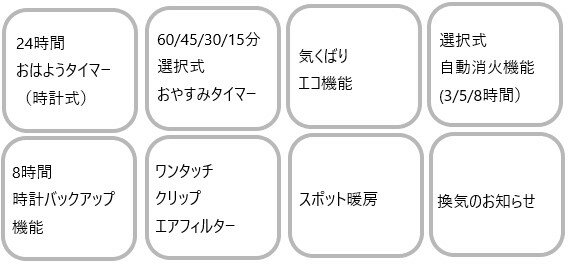 リンナイガスファンヒーター こちらの商品は都市ガス用です。 外形寸法(mm)高さ435×幅480×奥行168 (205) mm 質量(kg)7.9kg 色WH 暖房の目安 [木造] 15畳 [コンクリート] 21畳まで 暖房能力5.81kW (5,000kcal/h) 電源AC100V 50-60Hz (電源コード長さ2m) 消費電力17W 待機時消費電力0.7W 運転音40dB (A) ガス接続専用ガスコード(別売) タイマー[おはよう] 24時間タイマー (時計式) [おやすみ] 60/45/30/15分選択式おやすみタイマー 機能一覧・気くばりエコ機能 ・選択式自動消火機能(3/5/8時間) ・8時間時計バックアップ機能 ・ワンタッチクリップエアフィルター ・スポット暖房 ・フィルターサイン ・不完全燃焼防止装置 ・転倒時ガス遮断装置 ・ロックスイッチ ・ガスコード確認カバー ・換気お知らせ 特長1) 除菌イオン(第7.5世代プラズマクラスター)を搭載して、快適な室内空間をつくります 2) 立ち上がり時に約8%能力を大きくして暖房を行う「急速暖房」機能を搭載しています。 (最大約15分間) 3) 暖房能力を固定して運転する“スポット暖房運転”を搭載します。 4) お部屋の暖めすぎを防ぎ、効率よく暖房をおこなうエコ機能を搭載しています。 さらに、春先や秋口など比較的暖かいときは、エコを早めに効かせて、無駄な暖めすぎを防ぎ、エコ効 果を高めます。 5) 着脱のしやすいクリップ式のエアフィルターを搭載しています。 6) 1時間に1回、ブザーとランプで換気の必要性をお知らせする“換気お知らせ機能(換気サイン)” を搭 載しています。 7) 24時間時計式おはようタイマーを搭載しています。(8時間バックアップ機能付) 8) 15/30/45/60分を選択できるおやすみタイマーを搭載しています。 9) 3/5/8時間の選択式自動消火機能付です。 10) 設定室温は、L(10℃)・12℃〜26℃・H(50℃)の範囲で設定できます。 11) 小さなお子さまのいたずらや、誤ってスイッチを押しても作動しないように、ロック機能を搭載していま す。(∨∧スイッチ同時押し) 12) 環境配慮型商品として、鉛フリーはんだを採用します。 13) スイッチを押した時や安全装置が作動した時などにブザーでお知らせします。 14) サービスメンテ性向上のため、故障履歴及び積算燃焼時間、積算燃焼回数の記憶機能付です。熱電 対の出力及び過熱防止装置の温度を操作部に表示することができます。 15) ガスコードによる正しいガス接続を確認するためのガスコード確認カバーを付属しています。