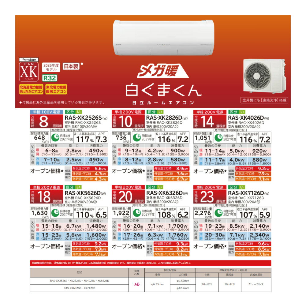 HITACHI 住宅設備用ルームエアコン XKシリーズ 2026年モデル メガ暖 白くまくん 厳しい寒さでもパワフル暖房&省エネ。 しかも暖かさが長続きします。 ★外気温-30℃でも運転可能 ■RAS-XK7126D(W) スターホワイト 冷暖房とも主に 23畳程度 《セット内容》 ・室内機 RAS-XK7126D(W) 17kg(kg) ・室外機 RAC-XK7126D 44kg(kg) ・リモコン RAR-BC2 ※単相200V 20A エルバー型プラグ 《 機能一覧 》 ◆つつみこみ暖房 設定しておくと、室温安定時に、気流感をやわらげたつつみこむような暖かさをお届けします。 ◆スピード暖房 高い暖房能力で、足もとからお部屋をすばやく暖めます。 ◆温風プラス 外気温‐15℃でも、約60℃の高温風。 吹き出す風の温度を高めた運転を30分間行います。もっと暖かい風が欲しい時などにお使いください。 ◆あらかじめ温風 霜取り運転に入る前に暖気の吹き出し温度をアップして強力運転。霜取り時の室温低下を緩和します。 ◆みはって霜取りS 室外熱交換器の温度と外気温をきめ細かくチェックし、必要な時だけ除霜運転を行うことで、暖房時の快適さを長続きさせます。 さらに、2列の室外熱交換器で霜取りに入りにくい運転を行います。 また、暖房運転を停止させた時に、室外機の霜付き状態をチェック。 霜が付いていると判断したら、霜取り運転を行います。 次の暖房スタート時は霜なしでスムーズな立ち上がりです。 ◆リバースファンデフロスト暖房 室内機のファンを逆回転させ、室内の暖気を利用して室外熱交換器の温度を上げます。 さらに室外機のファンを逆回転させ熱交換器に風を当てることで霜取り運転をアシストします。 ◆eco運転 センサーが人の動きと日差しの変化を見分けて、お部屋の状況に合わせた快適&省エネ運転を行います。 ◆オートオフ/オートセーブ eco運転中に誰もいなくなり1時間が経過すると自動的に控えめ運転(オートセーブ)、 誰もいない状態で3時間が経過すると、運転が自動で停止します(オートオフ)。 ◆熱交換器自動お掃除[凍結洗浄Premium] 熱交換器を凍らせて、解凍した水でホコリや油汚れを洗い流します。不在時に室内熱交換器を自動洗浄します。 また、タイマー洗浄や手動洗浄もできます。凍結洗浄し、乾燥させたあとイオンを内部へ充満させます。 ◆熱交換器自動お掃除[凍結洗浄]室外機 熱交換器を凍らせて、解凍した水でホコリや油汚れを洗い流します。定期的に室外熱交換器を自動洗浄し、汚れによる風量の低下を抑えます。 ◆銅 排水トレー自動お掃除[凍結洗浄] 定期的に銅 排水トレーを自動洗浄します。 ◆Premiumプラズマ空清 ワイドなプラズマ電極から放出されたプラズマイオンがホコリなどを帯電させ、熱交換器全面で捕集。 さらに強力な除湿で風が届きにくい場所のカビも対策します。 ◆ファン自動お掃除[ファンお掃除ロボ] ファンに付着したホコリを自動で掃除し、落とした汚れは洗い流します。 ◆フィルター自動お掃除 フィルターのホコリを自動でお掃除します。集めたホコリはダストボックスに収納します。 リモコンのボタンで運転停止時にお掃除運転もできます。 ◆ビッグ&ウェーブファン 室内機の大口径ファンに除菌※効果のある素材を採用。また、波形翼でピーク音を緩和します。 ※試験機関:(一財)ボーケン品質評価機構 ◆カビバスター(エアコン内部クリーン) 24時間365日エアコン内部をモニタリング。加熱・低湿制御によりカビを抑制します。 ◆プレシーズンお手入れ 冷房シーズン前に、内部をしっかり自動お掃除。さらに自動で故障診断を行います。 ◆ステンレス通風路 室内機のファンの奥にある通風路にステンレスを採用し、除菌※・防汚に効果があります。 ※試験機関:(一財)ボーケン品質評価機構 ◆ステンレスフラップ フラップにステンレスを採用し、除菌※・防汚に効果があります。 ※試験機関:(一財)ボーケン品質評価機構 ◆銅 排水トレー 排水トレーに銅を採用し、除菌※やヌメリ抑制に効果があります。 ※試験機関:(一財)北里環境科学センター ◆人感センサー [くらしセンサー]でお部屋の状況に合わせて快適&省エネ運転を行います。 人の活動量を検知します。 ◆日射センサー [暮らしセンサー]でお部屋の状況に合わせて快適&省エネ運転を行います。日差しの変化を検知します。<br> ◆風よけエリアセレクト お部屋を9または4エリアに分割し、その1つに「風よけ」を設定できます。風にあたりたくない場合などにお使いください。 9分割対象機種:2.8kWクラス以上のXKシリーズ。4分割対象機種:RAS-XK2526S。 ◆カラッと除湿:手動・自動カラッと除湿 独自の再熱方式で、寒くならずにしっかり湿度を下げる除湿です。外気温1℃から除湿できるので、寒い日でも、除湿が活躍します。 運転スタート時にお部屋の温度をチェック。その時にぴったりの温度に自動設定して除湿します。(自動) 設定した室温と湿度で、除湿します。(手動) ●条件によっては、室温・湿度が設定通りにならない場合があります。 ◆カラッと除湿:ランドリー除湿 