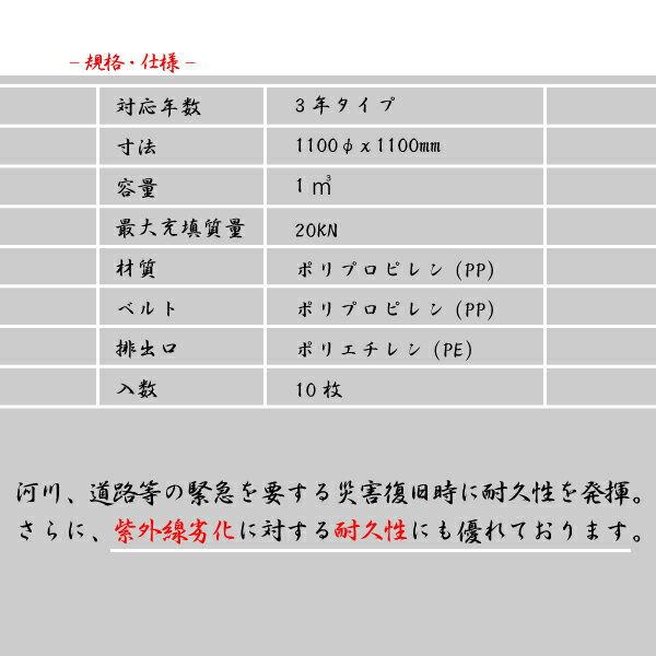 商品情報 概要 『 耐候性大型土のう袋 土嚢袋 黒 3年 2t 排出口付 丸型 トン袋 紫外線劣化防止 土木 河川 工事 土塁 水害 防災 10枚 サイズ 1100φ x 1100 mm 』 特徴:耐候性に優れた色である「黒」を採用。耐久性にも優れ、長期的(約3年)工事に適した大型耐候性土のう 【用途】 長期の土木・河川工事の土塁設置、 災害・水害用などに 【形状】 丸型・ベルト2点吊り(4点支持) 【袋型】 投入口全開 排出口無(底止)排出口付 【容量】 1m3 【最大充填質量】 20KN(約2トン) 【設計容量】 1045L 【材質】 本体/ポリプロピレン(PP) 【サイズ】 1100φ x 1100mm 【入数】 10枚 【色】 黒 その他 ※大型商品ですので、写真6枚目の注意をご確認宜しくお願い致します。 ※製品仕様は予告なく変更することがあります。予めご了承ください。 ※この商品は商品代引は使用できません。ご清算の時には必ず「クレジットカード」か「銀行振込」をお選び下さい。 ※この商品は「取り寄せ品」です。発送まで3〜5日かかることがあります。耐候性大型土のう袋 土嚢袋 3年 トン袋 フレコンバッグ コンテナバッグ 排出口付 2点 吊り 2t 丸型 容量 1000L ブラック 黒 UV 紫外線劣化防止 長期 土木 河川 工事の土塁 水害 防災 建築 10枚セット サイズ 1100φ x 1000 mm ポリプロピレン PP ポリエステル おすすめ 特徴:耐候性に優れた色である「黒」を採用。耐久性にも優れ、長期的(約3年)工事に適した大型耐候性土のう 用途:長期の河川・土木工事の土塁設置、水害・災害・防災用など 袋型:投入口全開 排出口無(底止)排出口付 形状:丸型・ベルト2点吊り(4点支持) 最大充填質量:20KN(約2トン) 設計容量 : 1045L 容量:1m3 材質:本体/ポリプロピレン(PP) サイズ:1100φ x 1100mm 入数:10枚 色:黒 対応可能スタンド 折りたたみ式軽量スタンド 折りたたみ式ローコストスタンド 差しこみ式角型スタンド 耐候性大型土のう袋 耐候性1年 内袋無 耐候性3年 内袋無 耐候性3年 内袋1枚 2