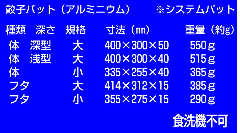 プロ御用達のアルミニウム製 谷口金属工業のアルマイト加工 アルミ 餃子バット専用フタ 大(フタのみ) L 伝統の職人がプレスして丁寧に仕上げている日本製です。外面 内面はアルマイト加工を施しておりますので耐久製抜群。またアルミニウムは軽くて取扱いもラクラク!ブランド・谷口金属工業株式会社・日本製・サイズ414×312×15mm・重量385g・板厚0.9mm・アルミニウム製 画像2はイメージです。プロ御用達シリーズ 第二弾餃子・製麺・システムバット用フタ