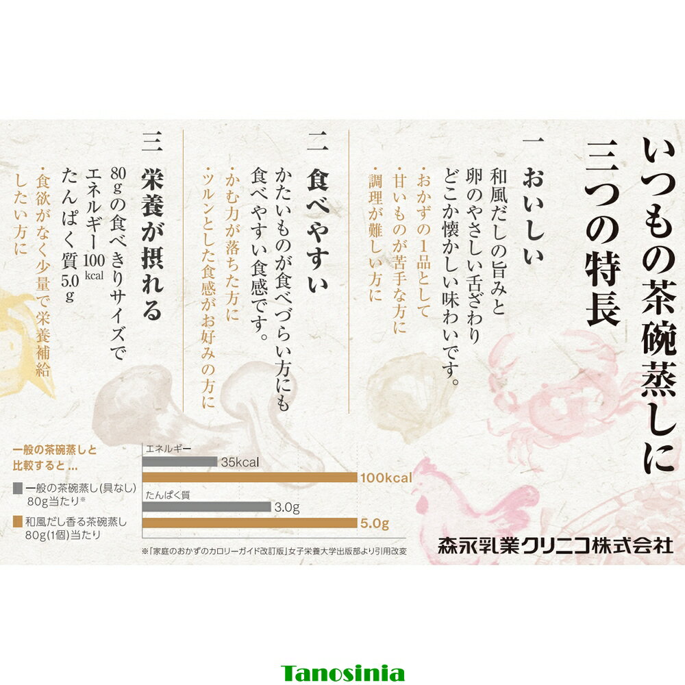 ・栄養にも配慮した和風だしの旨みと卵のやさしい舌ざわりの茶碗蒸しです。・甘いもの、乳製品が苦手な方にもおすすめです。・毎日の食卓にとうぞ!●たんぱく質量/5g●内容量/80g●保存方法/常温保存●容器/アルミカップ、フタ/プラスチックフィルム【 当日〜翌日発送可(土・日除く) 】