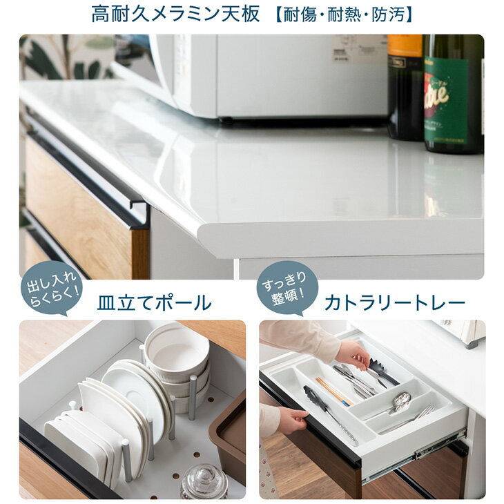 ▼よりワイドな120cmタイプもございます▼ 超高耐久! ▼ステンレス天板のキッチンカウンターもございます▼ 幅90cm 便利な"マグネットパネル"付▼食器棚もございます▼ ◆お客様の手間は一切不要◆▼組立・開梱設置サービスはこちら▼ 仕様 サイズ 外寸:幅90x奥行48x高さ85cm 【スタッフわんちゃんのおすすめポイント】 ・お部屋に合わせて選べる木目&ストーン調 ・高耐久&お手入れ簡単 メラミン天板 ・奥行ゆったり48cm 大型レンジ対応 ・すっきりしまえるカトラリートレー ・出し入れスムーズ!皿立てポール付き ・引き出しは全段フルスライドレール ・蓋付き家電の収納にぴったりなスライド棚 ・背面化粧仕上げで間仕切りとしても使える ・日本一の家具産地 大川産 重量 38kg 耐荷重 天板:約40kg スライド棚:約15kg 引き出し 上段:約10kg 引き出し 中段:約15kg 引き出し 下段:約15kg 開き扉収納:約15kg 素材 天板:AICAメラミン(ポストフォーム仕上げ) 表面材:強化紙 引き出し内部: 垣板・手前板・向板…プリント化粧繊維板 底板…プリント化粧繊維板 取っ手:アルミニウム 専用カトラリートレー:樹脂 皿立てポール:アルミニウム カラー オーク、ウォールナット、ストーングレー 梱包サイズ 93×51×88cm 生産国日本(大川家具) 送料【送料無料(北海道・沖縄県・離島は送料別途)】※北海道・沖縄県・離島の場合はお問い合わせください。※別途送料が必要な場合には、送料をご了承いただいてからの発送となります。 備考 【完成品】 ※配送は全て宅配便(1人)での玄関渡しとなります。大型商品や重量商品、エレベーターの無い2階以上にお住まいのお客様は、玄関口までの搬入をお手伝いをお願いしております事をご了承ください。 必ずご確認ください【後払い・時間指定不可】 ※こちらの商品はメーカー取り寄せとなるため、後払いでの出荷およびご注文後のキャンセル・変更はできません。また、メーカーに在庫がない場合は追加入荷までお待ちいただく場合が御座います。予めご了承ください。