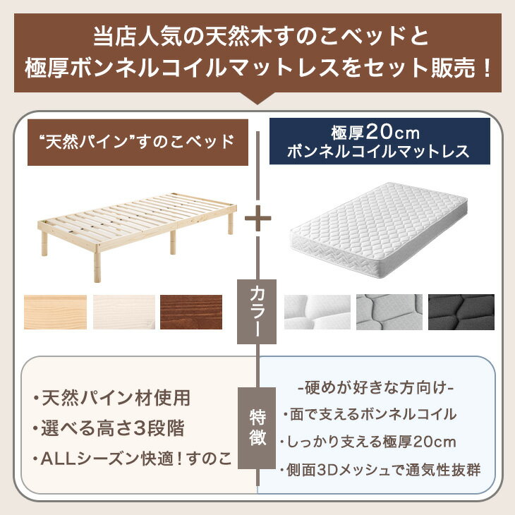 【正午~クーポン5%引】 ベッド マットレス付き 極厚20cm ボンネルコイル 3段階高さ調節 天然木 すのこベッド ベッドフレーム マットレス シングルベッド セミダブルベッド ダブルベッド クイーンベッド マットレス付 木製ベッド ローベッド 高さ調整 木製