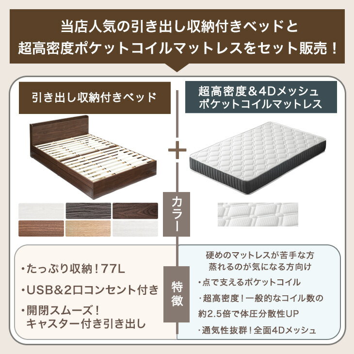 【本日クーポン5%引】 ベッド マットレス付き 超高密度&4Dメッシュ ポケットコイル 収納ベッド USB コンセント付き マットレス付 引き出し付き 収納付きベッド シングルベッド セミダブルベッド ダブルベッド シングル セミダブル ダブル マットレスセット