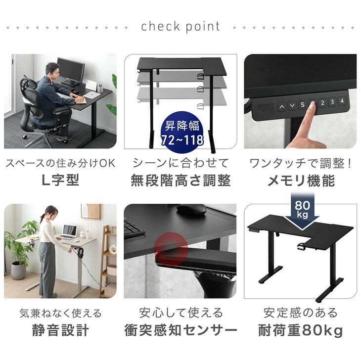 >>よくあるお問い合わせはこちら<< よりスピーディに高さ調節できる ▼電動昇降デスクはこちら▼ よりリーズナブルな ▼電動昇降デスクもございます▼ お部屋に合わせて組み換えOK!▼引き出し付きもございます▼ 仕様 サイズ 外寸:幅120x奥行90x高さ72~118 cm 重量 約24kg 耐荷重 天板:約80kgドリンクホルダー:約1kg フック:約5kg 素材 天板:低圧メラミン化粧繊維版スチール(粉体塗装) 昇降スピード 23mm/s カラー ブラック、グレージュ 梱包 サイズ 100x36x15cm 生産国 中国 スタッフいましゅんの おすすめポイント ボタン一つでお好みの高さに電動昇降デスク ・好きな高さを4パターン登録可能 メモリ機能 ・ストレスフリー! 静音昇降 ・挟み込みを防ぐ 衝突防止センサー付き ・作業スペースの住み分けがしやすいL字型 └お部屋に合わせて左右組み換えOK! ・キズに強い メラミン天板 ・がたつき防止アジャスター付き 備考 【組立品(大人2人で約1時間)】 ※配送は全て宅配便(1人)での玄関渡しとなります。大型商品や重量商品、エレベーターの無い2階以上にお住まいのお客様は、玄関口までの搬入をお手伝いをお願いしております事をご了承ください。 ※書き物をされる際は下敷きなどをご利用していただきますようお願いいたします。 ※天板は1枚板ではなく、分割仕様となっております。継ぎ目が生じますが、強度や安定性には問題ございません。 送料 【送料無料】