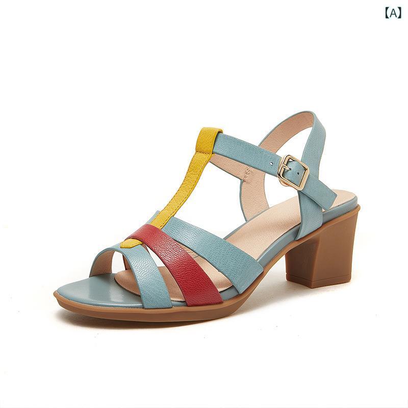 サンダル レディース 羊革 レザー 高ヒール Tストラップ 配色 滑り止め 快適 歩きやすい ラウンドトゥ チャンキーヒール 本革 靴 シューズ 彩藍 彩杏