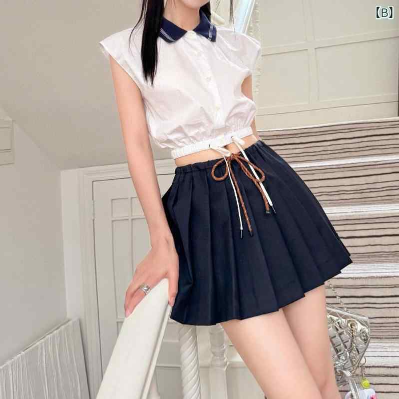 スカート レディース 刺繍 ネイビー ウール プリーツスカート 紐付き Aライン ミニスカート ひざ丈スカート