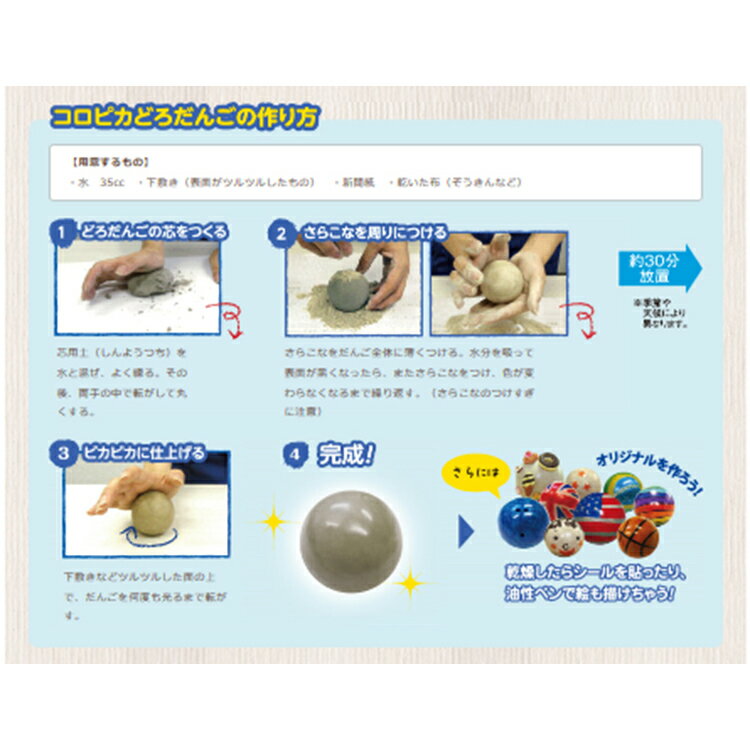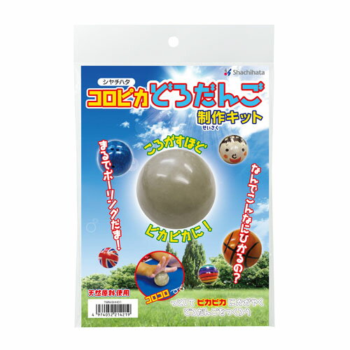 ピカピカのどろだんごを作ろう! ■特長 自然の砂と粘土を材料に、転がすほどピカピカに 輝くだんごが作れる“コロピカどろだんご制作キット” 転がすほどピカピカに輝き、乾燥したらシールを貼ったり、 油性ペンで絵を描いてオリジナルのどろだんごが 作れます。 ■セット内容 ・芯用土(約200g) ・計量スプーン(約10cc) ・さらこな(約40g) ・台紙(中面に作り方の説明があります) ■注意事項 ※必ず保護者の方と同伴の上、ご使用ください。 ※手に付いた砂や色こな、どろだんごをお子様が なめたりしないよう充分ご注意ください。 ※完成したどろだんごを投げたりしないでください。 ※砂や色こなが目に入った場合は、すばやく大量の 水で洗い流してください。 ※砂を排水口に流すとパイプが詰まる場合があります のでご注意ください。 ※廃棄する際は、お住まいの地域の条例に従って 捨ててください。 □販売元:シャチハタ
