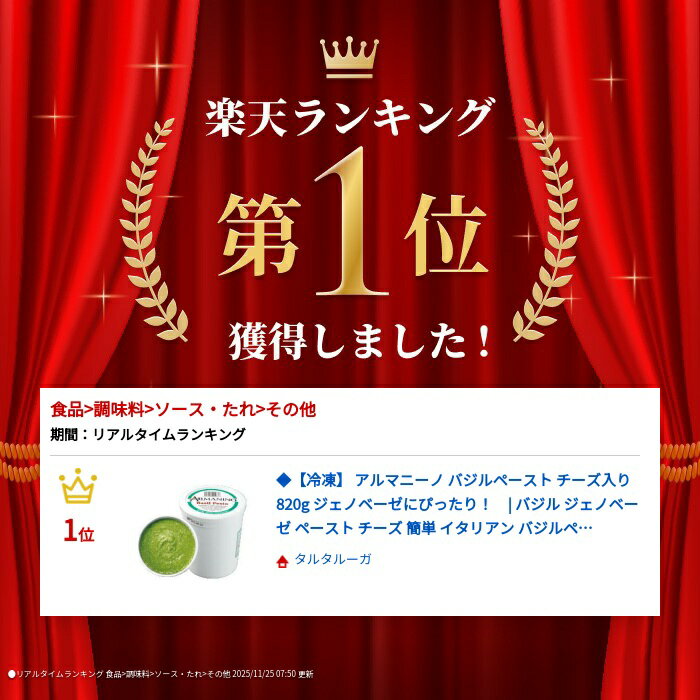 摘みたて新鮮なバジルに、ガーリック・なたね油、パルメザンチーズをブレンドした伝統的ジェノバソース。 ジェノヴェーゼにぴったり! 冷凍商品は冷蔵・常温商品とは同梱出来ません。 冷凍商品をご注文の際は冷凍商品のみでのご注文をお願いいたします。 冷蔵・常温商品と一緒にご注文の場合正しく送料が表示されず、追加送料確認の為に発送が遅延いたします。 ※送料に関しましてはご利用ガイド内に記載しておりますので、ご確認の程よろしくお願い申し上げます。