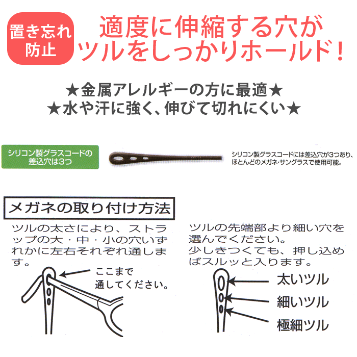 ※郵送なら送料無料は「メール便」をご選択ください。 クロネコDM便、定形外郵便(代金引換は定形外郵便)で配送する場合は「全国送料無料」です。配送日時の指定はできませんので予めご了承ください。 仕様:グラスコード(メガネチェーン) サイズ:約60cm(通常時) 原材料:シリコン 耐熱温度:-30℃〜+100℃ MADE IN CHINA 【取扱い上の注意】 ●カッターや鋭利な物に当てないようにしてください。ストラップが切れる可能性があります。 ●メガネを無理に引っ張ったり、ストラップを持って振り回さないでください。 ●汚れたら中性洗剤で洗ってください。 ●シリコンは安心素材ですが本製品の使用により、アレルギー等の皮膚の異常を感じた場合は、使用を中止し医師の診断を受けてください。