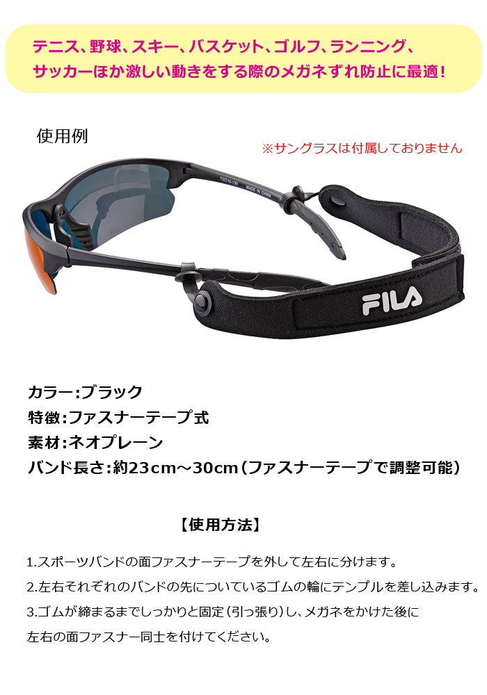 テニス、野球、スキー、バスケット、ゴルフ、ランニング、サッカーほか激しい動きをする際のメガネずれ防止に最適! ※郵送なら送料無料は「メール便」をご選択ください。 定形外郵便で配送する場合は「全国送料無料」です。配送日時の指定はできませんので予めご了承ください。 FILA(フィラ)メガネスポーツバンド カラー:ブラック 特徴:ファスナーテープ式 素材:ネオプレーン バンド長さ:約23cm~30cm(ファスナーテープで調整可能) 幅:約2.2cm 対象年齢:子供から大人用↓写真をクリックすると拡大します