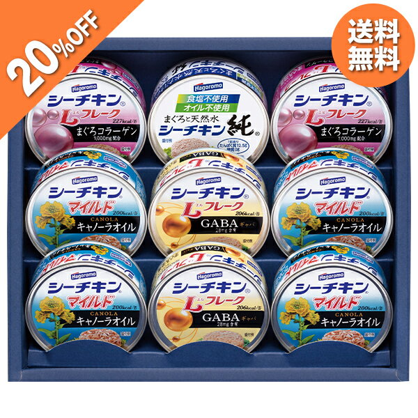 【セット内容】シーチキンマイルドキャノーラオイル(70g)×6、シーチキンLフレーク(コラーゲン入り・GABA入り)・まぐろと天然水で作ったシーチキン純(各70g)×各3【箱サイズ】21.5×40.1×6.7cm 【賞味期間】常温3年 心からの”ありがとう”をギフトに込めて。人生に節目に思い出されるのは、お世話になった人たちの顔。ともに喜び、悲しみ、励ましあった友人、いつも寄り添い導いてくれた大切な人たちへ、心からの”ありがとう”をギフトに込めて。はごろもフーズ 「人と自然を、おいしくつなぐ」ギフト専用商品を中心に、様々なおいしさを楽しめるシーチキンギフトです。ギフト専用のシーチキンを含めた、さまざまなおいしさが楽しめる『シーチキン』の詰め合わせです。賑やかな食卓のシーンを簡単に楽しめます。 食卓が華やぐギフトです。手土産やギフト、おウチで召し上がるにもおすすめです。バラエティー豊かなギフトなので幅広い年代の方に召し上がって頂けます。【商品に関するご注意】ラッピング・熨斗は行っておりません。商品欠品時は、お届けにお日にちを頂く場合がございます。その際は、改めてご連絡致します。商品は、商品に貼付の取扱説明書に添ってご利用下さい。メーカー受注品の為、商品の仕様や価格等につきましては、予告なく変更される場合があります。また、メーカーにて廃番や完売の時は、誠に勝手ながら、ご注文をキャンセルとさせて頂く事がございます。ご了承下さい。お使いのブラウザやモニターによっては、実際のお色と若干異なる事がございます。