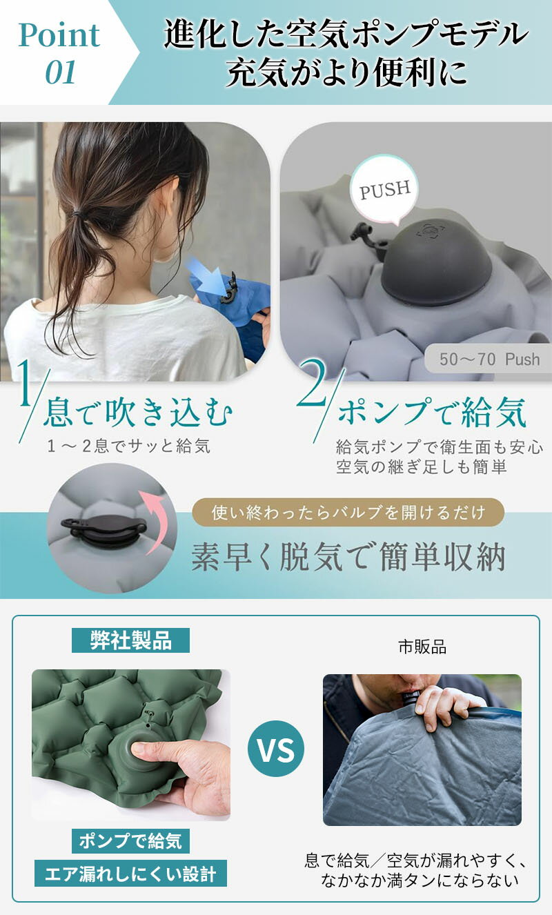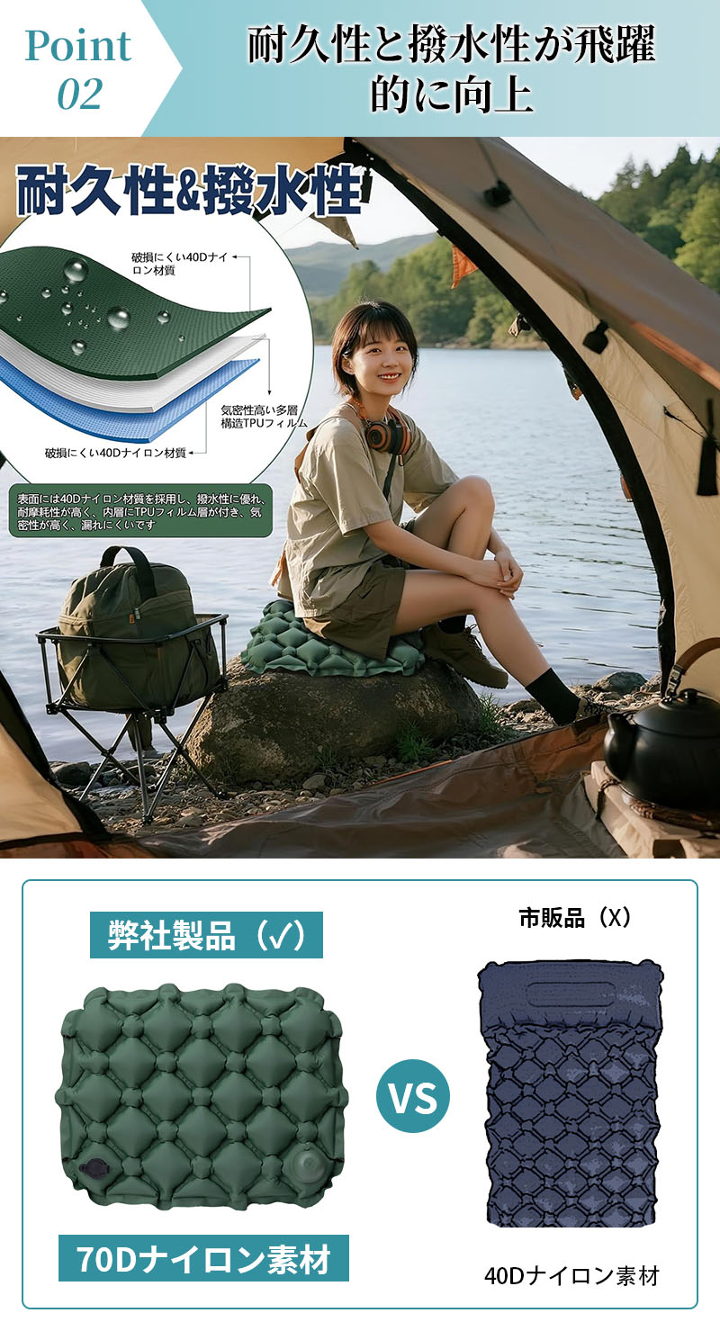【商品の説明】 この商品について ●【どこでも、心地よく】弊社のエアークッションはアウトドアの達人が選んだ、軽量×快適を実現したギアです。花見やキャンプなどどこでも使える、あなたの冒険に寄り添うマルチギアです。 ●【どこでも活躍】「持っててよかった!」があなたの生活にプラスされます。持ち運びできるからこそどこでも活躍できます。様々なシーンであなたの役に立ってくれます。 ●【アウトドアの達人推薦】アウトドアギアの達人が自信をもって推奨した商品です。軽さ、コンパクトさ、座り心地はもちろんの事簡単に取り扱いができる商品です。 ●【簡単エア注入&逆流防止バルブ付】空気を入れやすく、好みの硬さに調節できます。 ●【驚きのコンパクト収納】付属の外袋にしまえば「手のひらサイズ」へ。カバンやザックに入れてもかさばりません。重量は約110g。収納時は高さ13cm、幅6cmととてもコンパクトに収納できます。