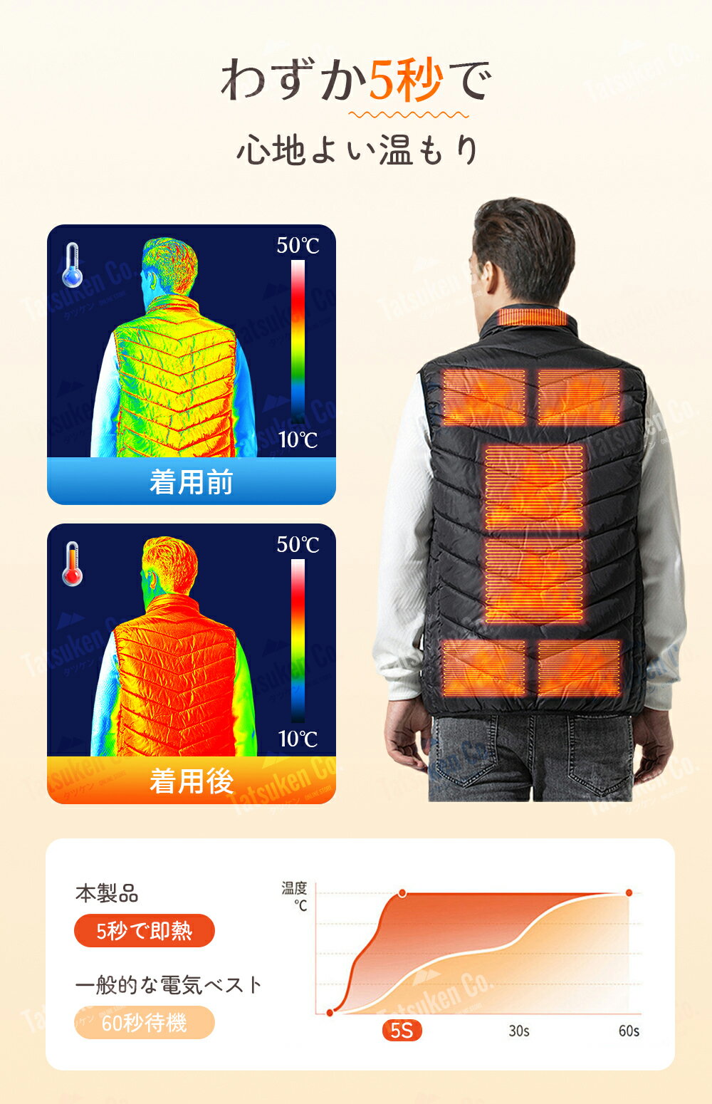 商品説明商品名電熱ベスト (電熱ベストのみ)製品仕様表地:ポリエステル100%裏地:ポリエステル100%ヒーター枚数:9枚加温素材:日本製繊維ヒーター加熱温度:25℃~50℃温度調節:3段(高温/中温/低温)電圧:USB:5V電流:USB:2A-2.1A特徴:大きいサイズサイズ:S/M/L/XL/2XL/3XL/4XL/5XL/6XLカラー:ブラック/グリーンマーク種類:PSE商品の仕様は予告なく変更することがあります。使用手順1、ポケット中の内蔵USBプラグをモバイルバッテリーと接続する。2、胸部の電源ボタンを2秒ほど長押しすると、ベストは予熱を開始する。3、ボタンを短く押す度に、赤(高温)白(中温)青(低温)へと切り替わり、お好みの温度/温めたい箇所を選択してください。4、電源を切りたいときは、温めた箇所のボタンが消点するまで長押ししてください。説明書:電熱ベストの取り扱い説明書を一緒にお送りします。さらに使いやすくなります。【質問】1.質問:品質は高いですか?回答:弊社のブランドです。発熱効果は市販のベストよりはるかに大きい。制品の多くは関連の検査認証をして、発熱糸も日本制なので、安心して大胆に使用してください。寿命は一般的な発熱ベストの2 ~ 3倍。2.質問:洗濯しても本当に大丈夫ですか?気を付ける点はありますか?回答:バッテリーに接続する部分は防水仕様のため水に濡れても大丈夫です。ただし、洗濯後、完全に乾燥させてからバッテリーと接続して下さい。 洗濯機で洗濯する場合はネットに入れて弱流で洗って下さい。メーカーは手洗いをオススメしております。洗濯時や手洗い時に、力を入れて強くねじらないで下さい。配線が断線する可能性があります。ご注意下さい。洗濯後、完全に自然乾燥させてからご使用下さい。注意事項「サイズを1つ大きくすることをお勧めいたします。ゆったりとした着用感が得られ、より快適にお過ごしいただけます。」電熱ベストには恒温保護作用があります。プラグを挿してから3-5分后、自働的に高温から低温に切り替わります。これは正常な現象です再度高温モードでご利用の場合は再度高温モードを手動で設定してください,その後ずっと高温の状態です。長時間使用すると、自働で消灯したり、自働で低温状態になったりすることがあります。これは正常サーモスタット保護作用です。出てきたら、半分くらいのうちに、もう一度スイッチを入れてください。余熱がない状況で手で水洗えます。洗濯する前に必ずバッテリーを取り外してください。強力に揉まないで下さい。ベストはUSBケーブルが付属しており、市販のUSB 2A5V以上の出力モバ閲覧される環境により画像の色味等が若干が変わって見える場合がございます。予めご了承下さい。電力供給が不足している場合は、十分に発熱しない可能性があります。関連キーワード電熱ベスト バッテリー付き 電熱 ベスト ワークマン 温熱ベスト ヒーターベスト 発熱ベスト ヒートベスト 日本製ヒーター内蔵 Vネックヒーターベスト 袖なし 加熱 ウェア 電気ベスト 加熱服 ヒーター付きベスト 10000mAhバッテリー付属 20000mAhバッテリー暖房ベスト ホットベスト 電熱ジャケット 速暖 電気ベスト USB式給電 ヒータージャケット 防寒ウェア アウトドア 軽量 通勤通学 作業着 保暖服 水洗い可 男女兼用 加熱 ベスト USB給電 洗濯可 ヒーター付きベスト ヒーター ベスト レディース メンズ おすすめ 電熱ジャケット 男女兼用 ベスト バッテリー給電 加熱 保温 防寒対策 バイク ゴルフ 釣り 登山 キャンプ 通勤通学 屋外作業 アウトドア プレゼント用 クリスマス 父の日 母の日 敬老の日 防寒服 男女兼用 クリスマス ギフト 誕生日 バイク 釣り ゴルフ 新生活 父の日 母の日 敬老の日 防寒服 男女兼用 クリスマス ギフト 誕生日 バイク 釣り ゴルフ 新生活大量注文承ります!製造メ一カ一の直営店ですので、大量のご注文にも対応可能です。引き出物、内祝、香典返しや企業様の記念品、販促用商品などお気軽にご相談ください。メーカー希望小売価格はメーカーサイトに基づいて掲載しています
