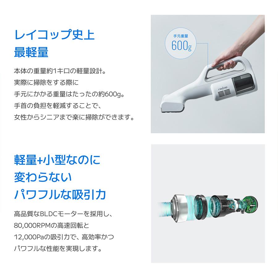 レイコップ布団クリーナー史上 最軽量×小型ヘッド×UV LEDで 99.9%ダニ除去(※1)&除菌(※2) フィルター計45枚付き! 小型スマートヘッドでコンパクトなため、布団やベッドの端、ソファの隅々まで使えます。 ベビーベッドやペット用品など、ファブリックアイテムの細やかな掃除にもおすすめのコードレス布団クリーナー。 インテリアに馴染むシンプルな自立式デザインです。 使い捨てフィルター計45枚をセットにしてお届けします。 レイコップ布団クリーナー史上最軽量 コードレスでさらに便利に 旧モデル(※RS-300JWH)約2.3kgに対して、本商品は約1.03kg。 最軽量設計で手首の負担を解放しスムーズなかけ心地を追求。 布団に自然と重さがかかる最適なヘッド角度とハンドル設計で、滑るような使用感を実現。 最軽量化された本体は、フラットな面以外にも枕やソファ背面などもラクにお掃除いただけます。 自立式かつシンプルなデザインは置く場所を選ばず、サッと手に取れて掃除がより身近になります。 独自技術「光クリーンメカニズム」 波長253.7nmの紫外線(UV)を照射 99.9%の除菌が可能(※) 医療現場で除菌に使われているLED UVライトを搭載。 LED UVライトから紫外線を照射することにより99.9%の除菌が可能に。(※) 「強力な吸引力」と「叩きブラシ」で 99.9%のダニ除去を実現(※) 約79,200回/分 高速でたたく「フィンパンチブラシ」と細かなゴミをかき出す「ファブリックブラシ」により、ダニのフンや死骸を含むハウスダストを繊維の奥から叩き出します。 さらに、高品質なBLDCモーターを採用し、80,000RPMの高速回転と12,000Paの吸引力で、高効率かつパワフルな性能を実現します。 花粉やPM2.5など超微細な粒子も99.9%キャッチ! 清潔でキレイな排気で、布団だけでなくソファーや衣類などいつでも大活躍 高性能HEPAフィルターを搭載しているので、花粉やPM2.5など超微細な粒子も99.9%キャッチ! 清潔でキレイな排気なので、お子さんやペットがいるご家庭でも安心です。 布団はもちろん、クッションやソファー・衣類・カーペットなど、家じゅう色々なシーンでご使用いただけます。 ※Suzhou GTT Services Co Ltd調べ:[方法]EN1822-3:2009 No.0596-20A-01 小型スマートヘッド 小型スマートヘッドでコンパクトのため、布団やベッドの端、ソファの隅々まで使えます。 手を汚さずゴミ捨てが可能に! ワンタッチでゴミ捨て可能なダストボックスと使い捨てフィルターを採用し、手を汚さずゴミ捨てが可能になりました。 ダストボックスを外して水洗いするひと手間も省けます。 使い捨てフィルター15枚+30枚 計45枚セット 注意事項 製品仕様 ●セット内容/本体、取扱説明書(保証書付)、ACアダプター、充電ケーブル(USB Type-c)、使い捨てフィルター 15枚+30枚(計45枚) ●サイズ(約)/38×15.2×16cm ●重量(約)/1.03kg ●材質/ABS樹脂 ●電源/USB Type-C ●音の大きさ(約)/≦72dB(A) ●使用電池/リチウムイオン電池 ●充電時間(約)/ 4~6時間(5V 2A)(充電環境によっては充電にかかる時間が異なる場合があります。) ●連続使用可能時間(約)/標準モード:30分、パワーモード:16分(使用環境によって稼働時間が異なる場合があります。) ●保証期間/1年 ●製造/中国 ※取扱説明書をよく読んで使用してください。 【返品条件】返品B;未通電に限り、返品・交換が可能です。 raycop,レイコップ,UV,クリーナー,レニー,renny,除菌,ダニ,花粉,ハウスダスト,コードレス,掃除機,掃除,家電,布団,ふとん,布団用掃除機, TBSショッピング TBS キニナル ひるおびショッピング キニナルチョイス もっとキニナルチョイス きになる ブランチショッピング 王様のブランチ ブランチ TBS ブラショ カイモノラボ ラボ
