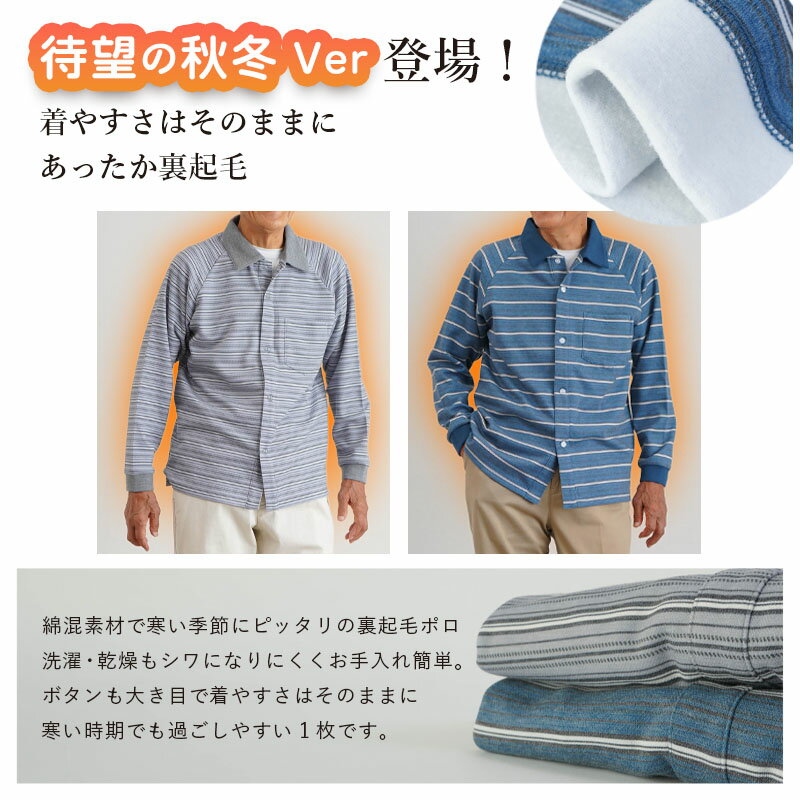 シニアファッション メンズ 80代 70代 60代 90代 秋冬 あったか 長袖 [装生] 乾燥機対応 紳士 裏起毛 ボーダープリント 前開き ポロシャツ おじいちゃん 服 誕生日 プレゼント 紳士服 男性 祖父 お年寄り 老人 高齢者 ギフト