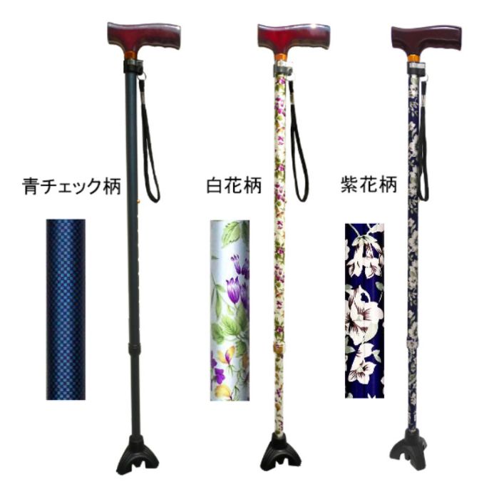 製品仕様 商品名 安心ステッキ さんさ 重量/サイズ ○長さ:79〜102cm(10段階調整)○グリップ幅:12cm○パイプ径:(手元)19mm、(杖先)16mm 素材 材質○握り:木製○支柱:アルミ カラー・種類 青チェック柄/白花柄/紫花柄 ご注意事項 モニターの発色の具合によって実際のものと色が異なる場合がございます。ご了承ください。 その他商品説明 ○穴があっても落ちにくい○砂利道でもしっかりグリップ 3本の足が砂利道でもしっかり地面をとらえます。○急な角度でついてもしなやかに接地 ふとした拍子に、急な角度でステッキをついても、三つ股の先ゴムがしなやかなクッション性をもって確実に地面をとらえます。