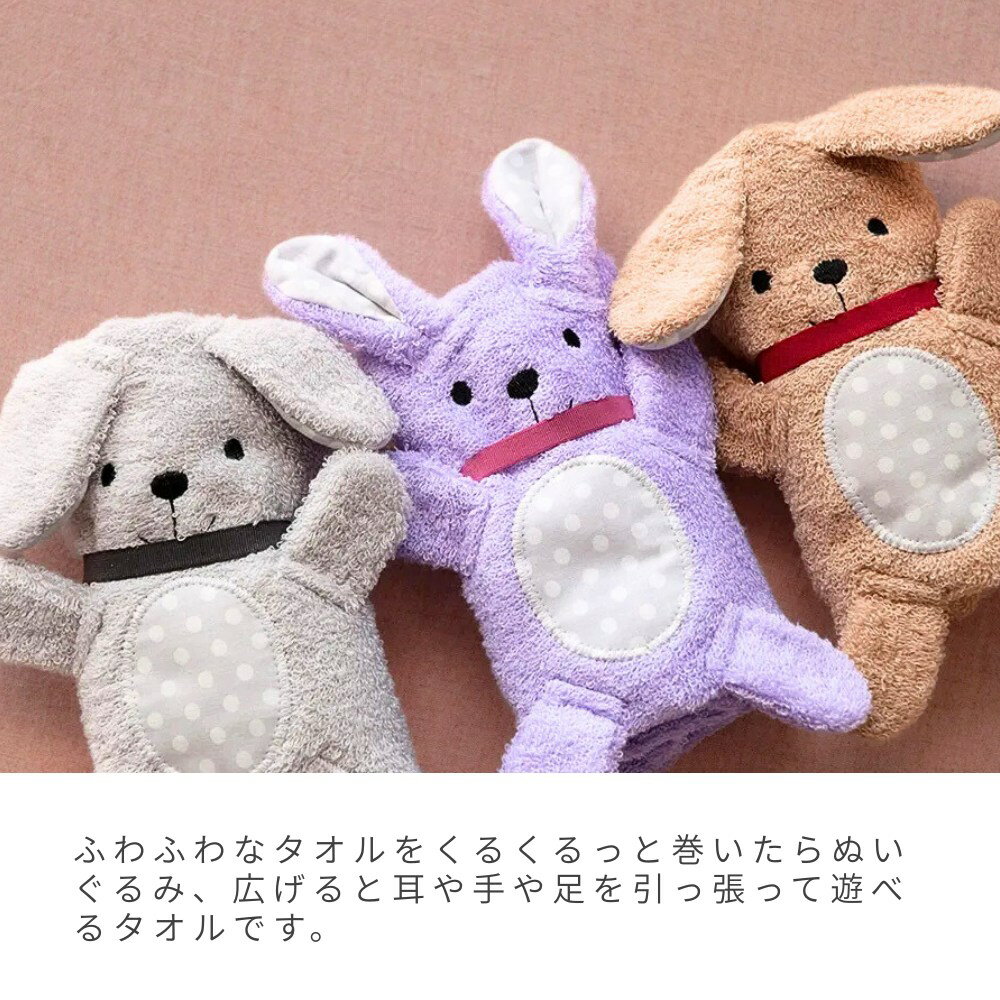 ループ付き うまれるぬいぐるみ ― 巻いて広げて遊べるぬいぐるみタオル ふわふわのタオルが、くるくる巻くと可愛いぬいぐるみに変身! 広げれば、耳や手足を引っ張って遊べる楽しいループタオルに早変わりします。 今治ブランド認定で、やさしい肌触りと高い吸水性を兼ね備えた一品です。 お子様とのお昼寝やお出かけ、幼稚園・保育園の持ち物としても大活躍です。 商品の特徴 2WAYデザイン:くるくるっと巻いてぬいぐるみに、広げてタオルとして使えるユニークな構造。 今治タオル認定品:柔らかく吸水性に優れた安心品質。 ループ付き:フックなどに引っかけられて便利。 キュートなデザイン:うさぎや犬の愛らしい表情でお子様もニッコリ。 肌にやさしい綿100%:デリケートなお肌にも安心で、毛羽落ちが少ない。 どんなシーンに最適なのか? ・お子様のぬいぐるみ兼ウォッシュタオルに ・幼稚園や保育園のお手ふきタオルとして ・お出かけやベビーカーでの持ち運びに ・出産祝いや入園卒園祝いのギフトにもおすすめ 製品情報 ・サイズ:34cm × 38cm ・素材:綿100% ・生産国:日本製(今治産) ・今治タオル認定番号:第2025-291号 ・カラーバリエーション:ベージュ / グレー / パープル タオルのお取り扱い注意点 ●パイルタオルは織物の性格上、パイルのループが、爪、指輪、時計など身の回りにあるもので、たやすく引き抜けやすい状態にあります。使用中パイルが引き抜けた場合は糸をハサミで切ってください。以後のご使用には差し支えありません。 ●濃色製品は色落ちする可能性があります。 ●お洗濯は40℃を限度として、洗濯ネットをご使用ください。 ●タンブラー乾燥はお避け下さい。 ●手絞りの場合は弱く、遠心脱水の場合は、短時間で絞る事をお勧めします。 ●濡れたまま長時間放置しないでください。 関連するシーンや用途: ループタオル キッズタオル ハンドタオル 子供用タオル ウォッシュタオル 可愛い ぬいぐるみ 綿100% 吸水性 柔らかい ギフト プレゼント お祝い ベビー キッズ クレシェンド 日本製 今治産 コットン 卒園 卒業 入園 入学 保育園ねむねむ タオルまくら LINE フェイスタオル ユアカラーズ タオルハンカチ AMICA タオルハンカチ 海のいきものがたり ハーフハンカチ DINO フード付きバスタオル 今治タオルの魅力を特集! ループ付き うまれるぬいぐるみ ― 巻いて広げて遊べるぬいぐるみタオル ふわふわのタオルが、くるくる巻くと可愛いぬいぐるみに変身! 広げれば、耳や手足を引っ張って遊べる楽しいループタオルに早変わりします。 今治ブランド認定で、やさしい肌触りと高い吸水性を兼ね備えた一品です。 お子様とのお昼寝やお出かけ、幼稚園・保育園の持ち物としても大活躍です。 商品の特徴 2WAYデザイン:くるくるっと巻いてぬいぐるみに、広げてタオルとして使えるユニークな構造。 今治タオル認定品:柔らかく吸水性に優れた安心品質。 ループ付き:フックなどに引っかけられて便利。 キュートなデザイン:うさぎや犬の愛らしい表情でお子様もニッコリ。 肌にやさしい綿100%:デリケートなお肌にも安心で、毛羽落ちが少ない。 どんなシーンに最適なのか? ・お子様のぬいぐるみ兼ウォッシュタオルに ・幼稚園や保育園のお手ふきタオルとして ・お出かけやベビーカーでの持ち運びに ・出産祝いや入園卒園祝いのギフトにもおすすめ 製品情報 ・サイズ:34cm × 38cm ・素材:綿100% ・生産国:日本製(今治産) ・今治タオル認定番号:第2025-291号 ・カラーバリエーション:ベージュ / グレー / パープル タオルのお取り扱い注意点 ●パイルタオルは織物の性格上、パイルのループが、爪、指輪、時計など身の回りにあるもので、たやすく引き抜けやすい状態にあります。使用中パイルが引き抜けた場合は糸をハサミで切ってください。以後のご使用には差し支えありません。 ●濃色製品は色落ちする可能性があります。 ●お洗濯は40℃を限度として、洗濯ネットをご使用ください。 ●タンブラー乾燥はお避け下さい。 ●手絞りの場合は弱く、遠心脱水の場合は、短時間で絞る事をお勧めします。 ●濡れたまま長時間放置しないでください。 関連するシーンや用途: ループタオル キッズタオル ハンドタオル 子供用タオル ウォッシュタオル 可愛い ぬいぐるみ 綿100% 吸水性 柔らかい ギフト プレゼント お祝い ベビー キッズ クレシェンド 日本製 今治産 コットン 卒園 卒業 入園 入学 保育園