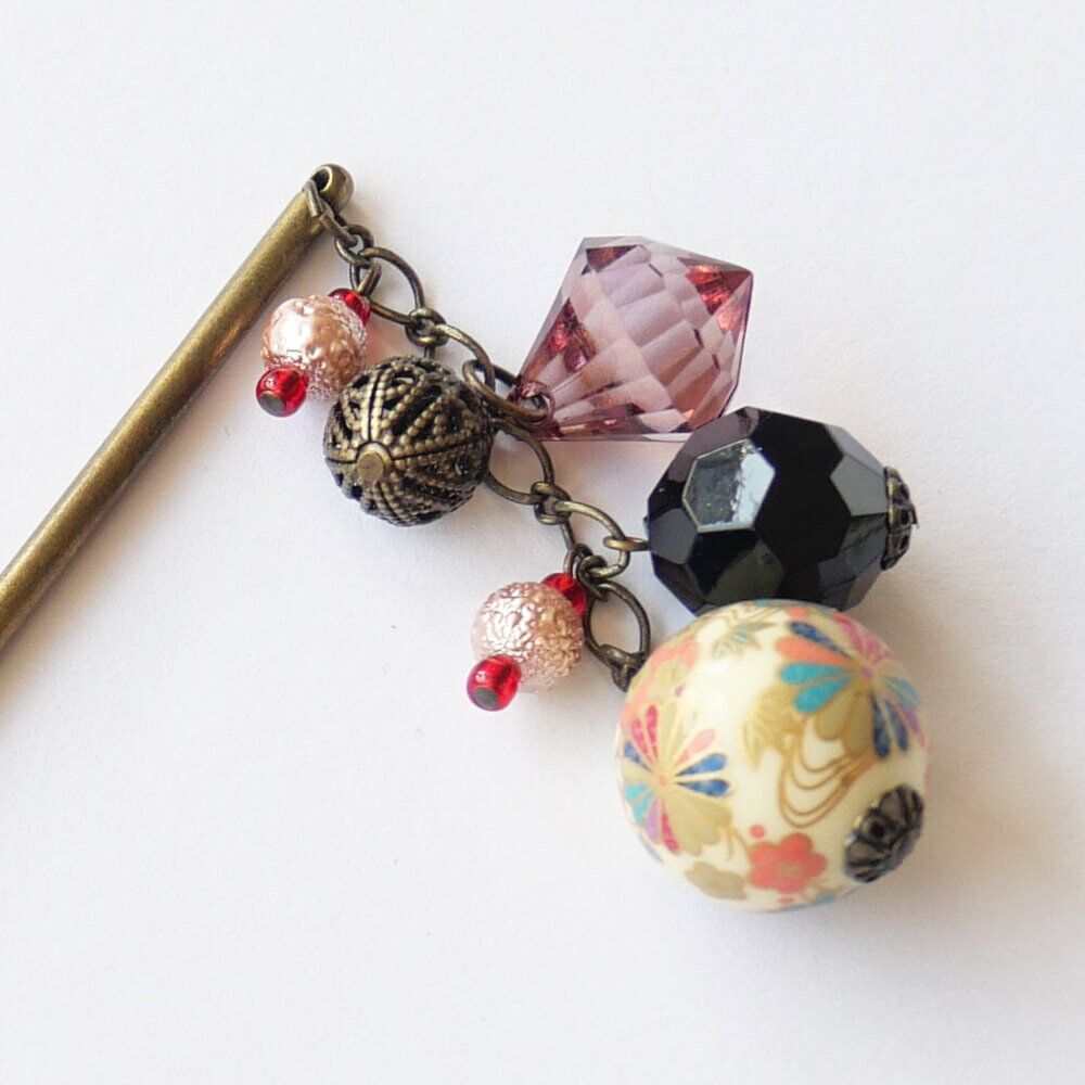 【オリジナルきものアクセサリー】 和柄の珠とカット玉のかんざし アンティークゴールド仕上げ 【サイズ】簪全長 約:12.5センチ モチーフ全長 約:6センチ 【素材】 合成樹脂、メタル、日本製