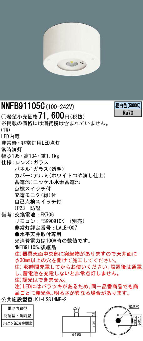LED内蔵非常時・非常灯用LED点灯 常時消灯色温度:5000K幅:φ195mm高:134mm質量:1.1kg電圧:100〜242V消費電力:1W【レンズ】ガラス【パネル】ガラス(透明)【カバー】アルミ(ホワイトつや消し仕上)【蓄電池】ニッケル水素蓄電池点検スイッチ付充電モニタ(緑)付自己点検スイッチ付IP23 防湿天井直付型、30分間タイプ・LED低天井用(〜3m)Ra70非常灯評定番号:LALE-007【交換電池】FK706【リモコン】FSK90910K(別売)●水平天井取付専用※消費電力は100V時の数値です。注)器具天面中央部に突起物がありますので天井面にφ30mm以上の穴を開けて施工してください。注)48時間充電してからお使いください。設置後は通電し、蓄電池を充電しないと非常点灯しません。注)調光はできません。注)LEDにはバラツキがあるため、同一品番商品でも商品ごとに発光色、明るさが異なる場合があります。※取付工事は必ず、工事店、電気店(有資格者)に依頼してください。一般の方の工事は禁止されています。