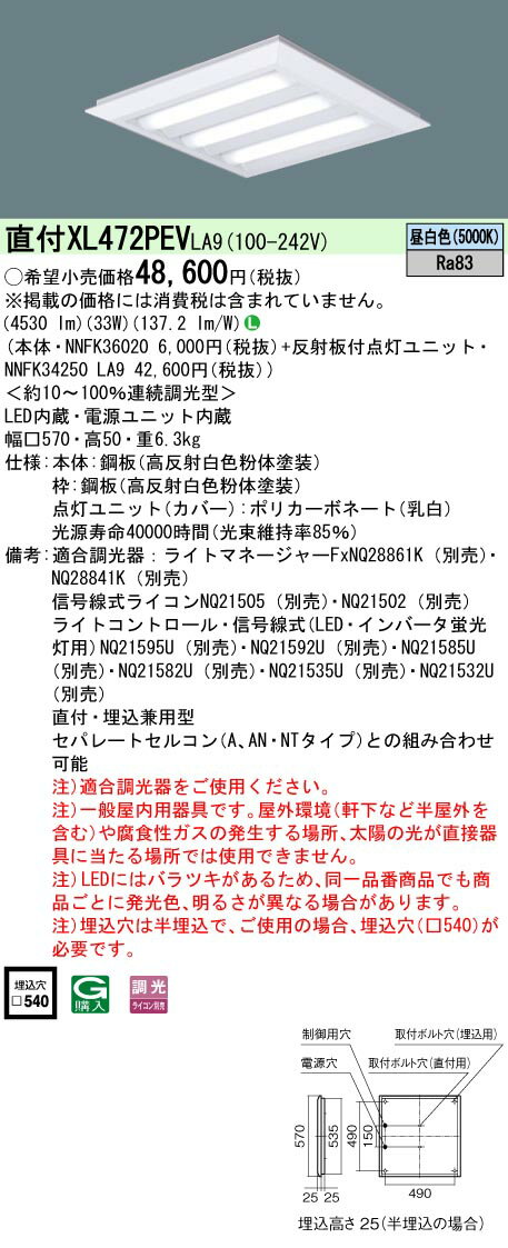 商品詳細 光源 ◆LED(昼白色)◆色温度:5000K◆光源寿命40000時間(光束維持率85%) 寸法・質量 ◆幅:□570mm◆高:50mm ◆質量:6.3kg 仕様・注意事項 ◆器具光束:4530lm◆安定器出力型:定格出力型◆安定器補足:<約10〜100%連続調光型>◆電圧:100〜242V◆消費電力:33W◆消費効率:137.2lm/W ◆【本体】鋼板(高反射白色粉体塗装) ◆【枠】鋼板(高反射白色粉体塗装) ◆【点灯ユニット(カバー)】ポリカーボネート(乳白) ◆天井直付型・天井埋込型 ◆Ra83 【適合調光器】ライトマネージャーFxNQ28861K(別売) 【適合調光器】ライトマネージャーFxNQ28841K(別売) 【適合調光器】信号線式ライコンNQ21505(別売) 【適合調光器】信号線式ライコンNQ21502(別売) 【適合調光器】ライトコントロール・信号線式(LED・インバータ蛍光灯用)NQ21595U(別売) 【適合調光器】ライトコントロール・信号線式(LED・インバータ蛍光灯用)NQ21592U(別売) 【適合調光器】ライトコントロール・信号線式(LED・インバータ蛍光灯用)NQ21585U(別売) 【適合調光器】ライトコントロール・信号線式(LED・インバータ蛍光灯用)NQ21582U(別売) 【適合調光器】ライトコントロール・信号線式(LED・インバータ蛍光灯用)NQ21535U(別売) 【適合調光器】ライトコントロール・信号線式(LED・インバータ蛍光灯用)NQ21532U(別売) ◆直付・埋込兼用型 ◆セパレートセルコン(A、AN・NTタイプ)との組み合わせ可能。 ◆注)適合調光器をご使用ください。 ◆注)一般屋内用器具です。屋外環境(軒下など半屋外を含む)や腐食性ガスの発生する場所、太陽の光が直接器具に当たる場所では使用できません。 ◆注)LEDにはバラツキがあるため、同一品番商品でも商品ごとに発光色、明るさが異なる場合があります。 ◆注)埋込穴は半埋込で、ご使用の場合、埋込穴(□540)が必要です。 コンパクト形蛍光灯FHP32形3灯器具相当 FHP32形3灯(節電)【本体】NNFK36020【反射板付点灯ユニット】NNFK34250 LA9※本商品は複数商品のセット型番です。商品はセットの構成品番にて到着します。 ※取付工事は必ず、工事店、電気店(有資格者)に依頼してください。一般の方の工事は禁止されています。