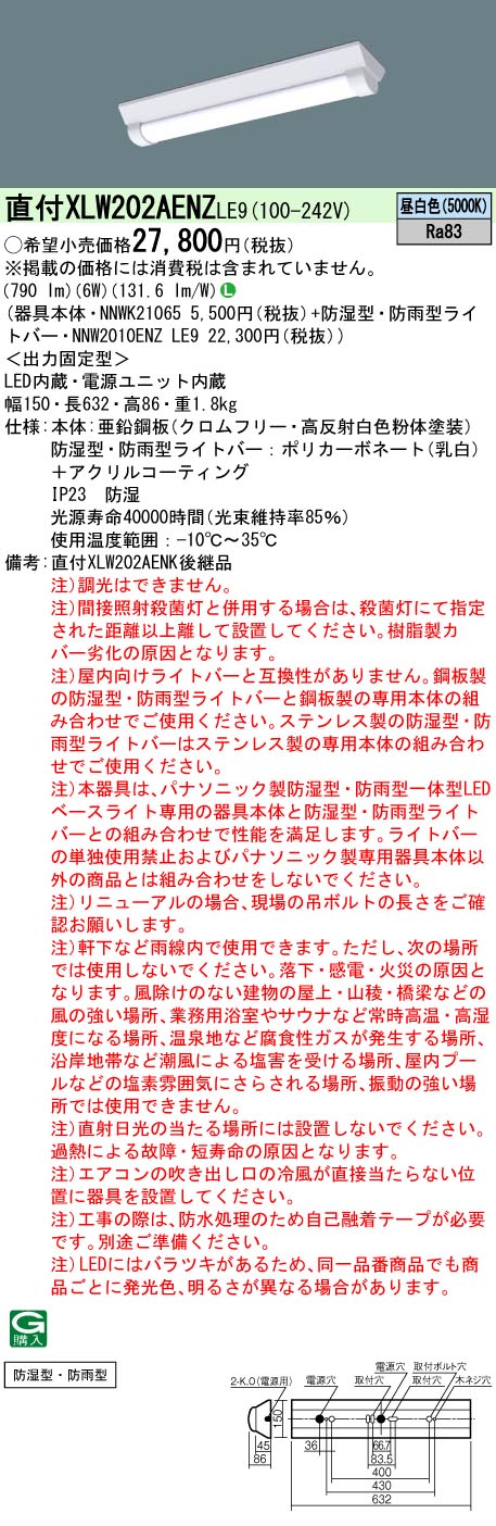 光源◆LED(昼白色) ◆色温度:5000 K ◆光源寿命40000時間(光束維持率85%)寸法・重量◆幅:150 mm ◆長:632 mm ◆高:86 mm◆質量:1.8 kg仕様・注意事項◆器具光束:790 lm ◆安定器出力型:定格出力型 ◆安定器補足:《出力固定型》 ◆電圧:100〜242 V ◆消費電力:6 W ◆消費効率:131.6 lm/W◆【本体】亜鉛鋼板(クロムフリー・高反射白色粉体塗装)◆IP23 防湿◆使用温度範囲:−10℃〜35℃◆Ra83◆注)調光はできません。◆注)屋内向けライトバーと互換性がありません。防湿型・防雨型ライトバーと専用本体の組み合わせでご使用ください。◆注)本器具は、パナソニック製防湿型・防雨型一体型LEDベースライト専用の器具本体と防湿型・防雨型ライトバーとの組み合わせで性能を満足します。ライトバーの単独使用禁止およびパナソニック製専用器具本体以外の商品とは組み合わせをしないでください。◆注)リニューアルの場合、現場の吊ボルトの長さをご確認お願いします。◆注)軒下など雨線内の屋側でご使用になれます。ただし、次の場所では使用しないでください。落下・感電・火災の原因となります。建物の屋上・山稜・橋梁などの風の強い場所、業務用浴室やサウナなど常時高温・高湿度になる場所、温泉地など腐食性ガスが発生する場所、沿岸地帯など潮風による塩害を受ける場所、屋内プールなどの塩素雰囲気にさらされる場所、振動の強い場所では使用できません。◆注)エアコンの吹き出し口の冷風が直接当たらない位置に器具を設置してください。◆注)工事の際は、防水処理のため自己融着テープが必要です。別途ご準備ください。◆注)LEDにはバラツキがあるため、同一品番商品でも商品ごとに発光色、明るさが異なる場合があります。※本商品は複数商品のセット型番です。商品はセットの構成品番にて到着します。 ※取付工事は必ず、工事店、電気店(有資格者)に依頼してください。一般の方の工事は禁止されています。