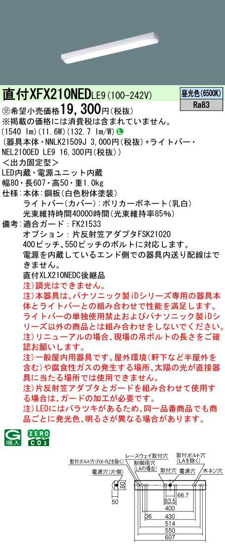 商品詳細光源◆LED(昼光色)◆色温度:6500 K◆光束維持時間40000時間(光束維持率85%)寸法・質量◆幅:80 mm◆長:607 mm◆高:50 mm◆質量:1 kg仕様・注意事項◆全光束:1540 lm◆安定器出力型:定格出力型◆安定器補足:<出力固定型>◆電圧:100〜242 V◆消費電力:11.6 W◆消費効率:132.7 lm/W◆【本体】鋼板(白色粉体塗装)◆【ライトバー(カバー)】ポリカーボネート(乳白)◆Ra83【適合ガード】FK21533【オプション】片反射笠アダプタFSK21020◆400ピッチ、550ピッチのボルトに対応します。◆電源を内蔵している側のエンドには電源穴がありません。◆注)調光はできません。◆注)本器具は、パナソニック製iDシリーズ専用の器具本体とライトバーとの組み合わせで性能を満足します。ライトバーの単独使用禁止およびパナソニック製iDシリーズ以外の商品とは組み合わせをしないでください。◆注)リニューアルの場合、現場の吊ボルトの長さをご確認お願いします。◆注)一般屋内用器具です。屋外環境(軒下など半屋外を含む)や腐食性ガスの発生する場所、太陽の光が直接器具に当たる場所では使用できません。◆注)片反射笠アダプタとガードを組み合わせて使用する場合は、ガードの加工が必要です。◆注)LEDにはバラツキがあるため、同一品番商品でも商品ごとに発光色、明るさが異なる場合があります。※グリーン購入法に基づく特定の化学物質の含有情報はこちら旧品番 XLX210NEDC LE9 [XLX210NEDCLE9]※本商品は複数商品のセット型番です。商品はセットの構成品番にて到着します。※取付工事は必ず、工事店、電気店(有資格者)に依頼してください。一般の方の工事は禁止されています。