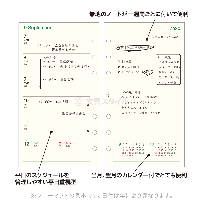 ダ・ヴィンチシステム手帳用リフィルの2026年版スケジュール&カレンダーです。 【週間・片面1週間+無地ノート・平日重視】 左ページ1週間スケジュール。平日のスペースを広くとった平日重視型です。右ページは自由に使える無地ノートになっています。 ・2026年日付入 16ヶ月分(2025年12月〜2027年3月) ・1月始まり、4月始まり両対応 ・左ページは1週間スケジュール ・右ページは無地ノート&カレンダー ・月〜金曜日のスペースを広くとった平日重視型 ・トモエリバー紙製 ・サイズ:聖書サイズ/バイブルサイズ(W95 x H170mm) ・梱包時:重さ約76g、厚さ約5mm ・リング:6穴 ・前年型番:DR2517 ・ブランド:ダ・ヴィンチ/ダヴィンチ/ダビンチ/Davinci ・メーカー:レイメイ藤井 (Refill_SB_Date) ※本製品を、お気に入りに登録するか、注文履歴から再注文いただくことで、翌年以降も、同じ商品の次年度版をより手軽に確実にご注文いただけます。 メーカー希望小売価格はメーカーカタログに基づいて掲載しています ※レビューには、同一フォーマットで年が前年までのものも含みます。(2025/8/1より2026年用となります)