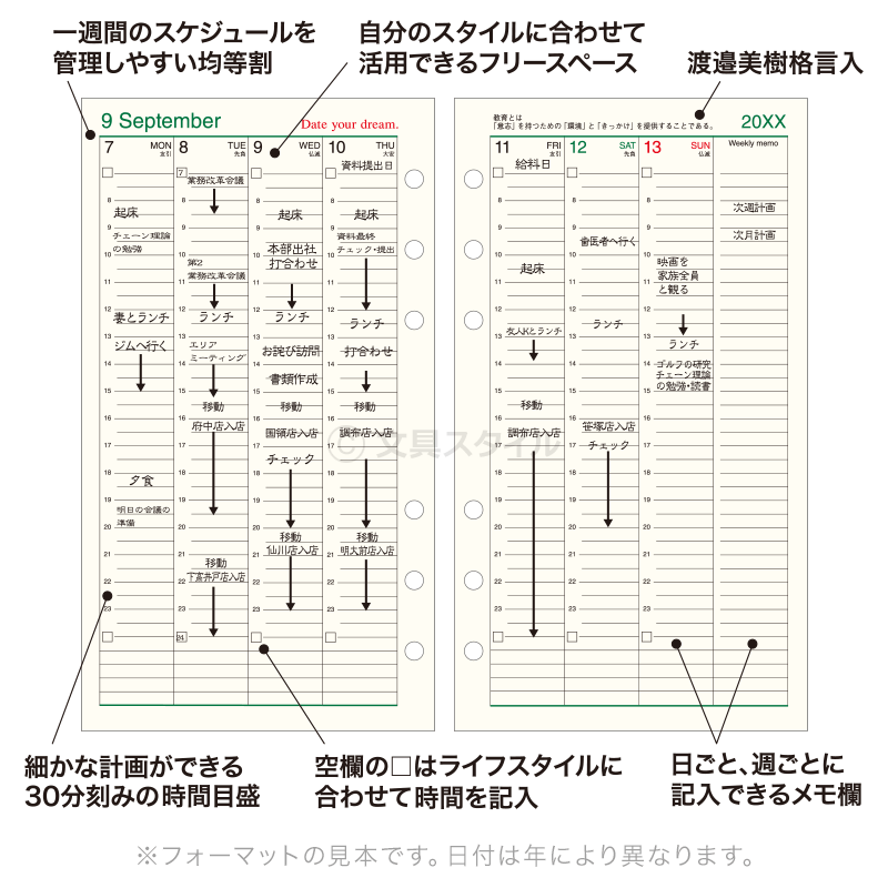 スケジュール管理の役目を果たすリフィルです。1週間の全体像が把握できます。随時修正を行います。 渡邊氏の格言入。 時間が入っていない□欄はライフスタイルに合わせて時間を記入。 時間が未定でもこの日に行うべきことをメモしておきます。 ここに「次月計画」と記載することで計画化・転記作業が必ず行われます。 ・サイズ:95x170mm ・2026年日付入 16ヶ月分(2025年12月〜2027年3月) ・前年型番:DR2598 (Refill_DYD_SB_Date) DYD ※本製品を、お気に入りに登録するか、注文履歴から再注文いただくことで、翌年以降も、同じ商品の次年度版をより手軽に確実にご注文いただけます。 メーカー希望小売価格はメーカーカタログに基づいて掲載しています ※レビューには、同一フォーマットで年が前年までのものも含みます。(2025/8/1より2026年用となります)