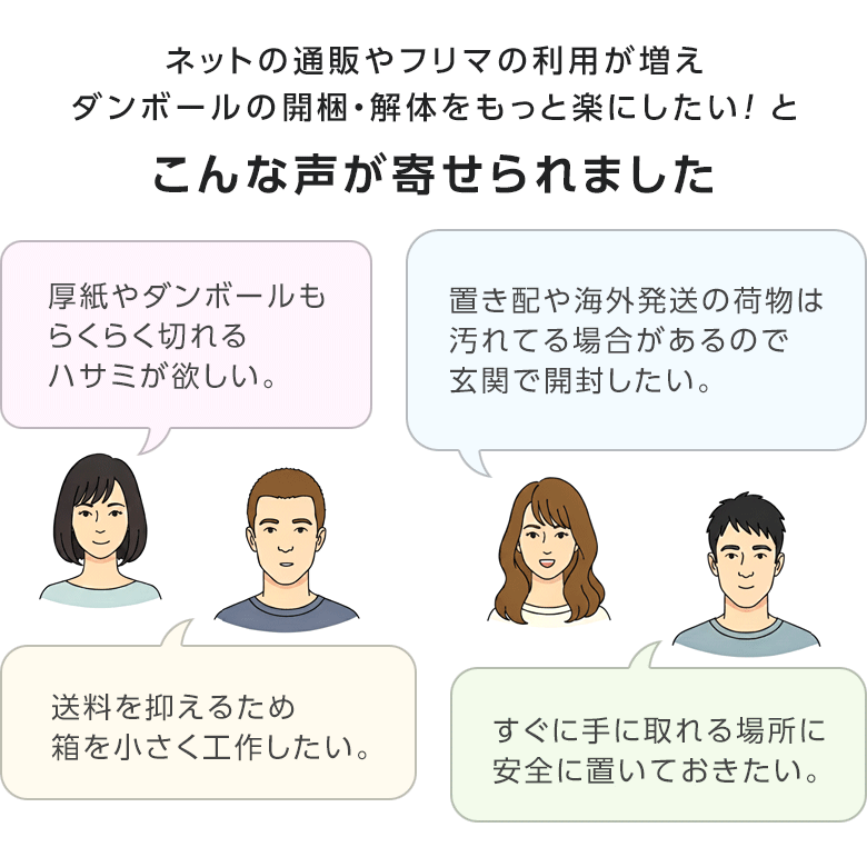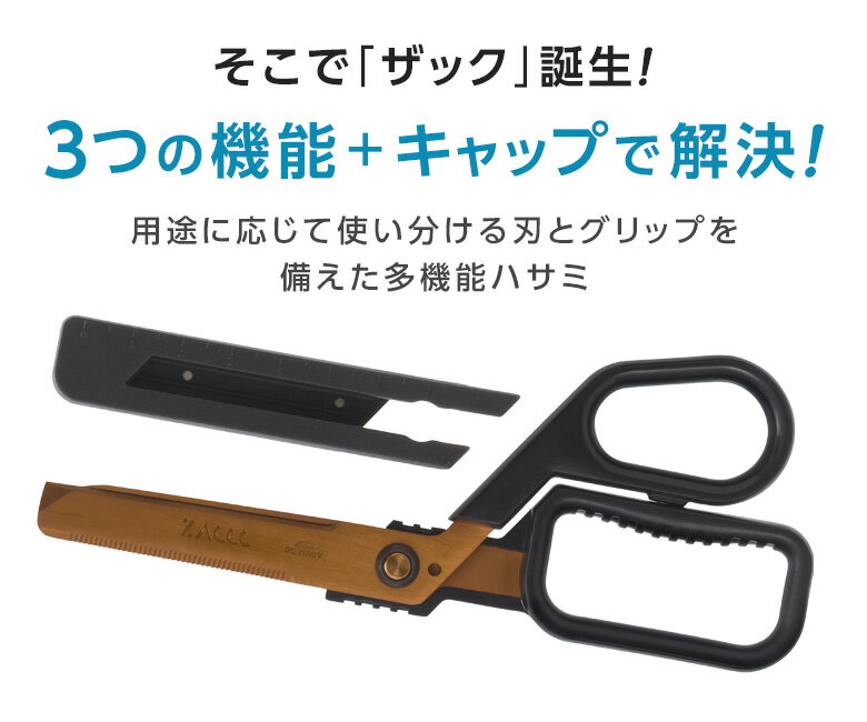多機能ハサミ「ザック ZACCC」は、ネット通販やフリマサイトの利用により増えたダンボールの、開梱から解体までをコレ1つで快適にこなす3つの機能を備えた多機能ハサミです。 「ハサミ刃」は、薄手の段ボールや厚紙、ペットボトルも楽に切れます。しっかり握れるハンドル形状で、手の小さい方でも使いやすくなっています。目盛り付きの刃や針金切りの穴など、あると便利な工夫も満載です。 「開梱カッター刃」は、ハサミ先端にあり梱包テープの切断に便利です。刃が短いので中身を傷つけずに荷物を開けることができます。 「解体ノコギリ刃」は、ダンボール箱のサイズ変更や形の調整、段ボールの解体に大活躍です。使い方はノコギリと同様ですが、削りカスが少ないので室内でも作業できます。 通常の刃より耐久性を高め良い切れ味が長持ちする、チタンコート刃タイプもラインナップしています。 キャップも付属するので保管・携帯も安心です。キャップの裏面にはマグネットが付いているので、玄関のドアやスチールラックなどすぐ手が届く場所にくっつけて保管すると、作業がスムーズです。 多機能ハサミとしてはシンプルなデザインで、男性・女性、学生から大人まで幅広い層におすすめできるカラーバリエーションです。 品番 スタンダード刃SH1357W オフホワイトSH1357A ブルーグレー(数量限定) チタンコート刃SH1358N ダークグレーSH1358B オールブラック(数量限定) 本体サイズ W63 × H155 × D10.5mm(キャップ含まず) 刃渡り ハサミ刃 60mmカッター刃 6mmノコギリ刃 44mm 刃厚 約2mm 包装サイズ W100 × H220 × D19mm 本体重量 55g(キャップ含む) 素材 刃=刃物用ステンレス鋼ハンドル=ABSカシメ=POMキャップ=PP+グラスファイバー・ネオジム磁石 付属品 マグネット付きキャップ メーカー 株式会社レイメイ藤井 [Scissors]