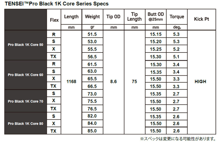 ※当店にクラブを送りの際は元払いでお送りください。 リシャフトをご希望の方は別途工賃、グリップをお買い求めください。 工賃をご購入されてない場合、作業遅れの原因となります。ご注意ください。■三菱 テンセイ プロ ブラック 1K コア TENSEI PRO BLACK 1K CORE 【単体購入不可】 新色の漆黒を纏った「TENSEI Pro Black 1K Coreシリーズ」 世界中のトッププレイヤーがその性能を認めるTENSEI(テンセイ)に新色が登場。 織目の細かさがしなやかにフィーリングをもたらす1Kクロスを、今作では初めて内層に搭載することでソフトなフィーリングをもたらし、その役割の変化を遂げている。 黒で統一されたコスメティックも一流プレーヤーの風格を感じさせるシックな仕上がり。 ※80は受注生産スペック。 モデル フレックス 重量 トルク 長さ(インチ) キックポイント チップ径 TENSEI Pro Black 1K core 50 R 51.5 5.3 46 元 .335 S 53.0 X 55.5 5.2 TX 56.5 5.1 TENSEI Pro Black 1K core 60 R 61.5 3.4 46 元 .335 S 63.0 X 65.5 3.3 TX 66.5 TENSEI Pro Black 1K core 70 S 73.0 2.7 46 元 ..335 X 75.5 TX 76.5 TENSEI Pro Black 1K core 80 S 82.0 2.6 46 元 .335 X 84.0 TX 85.0