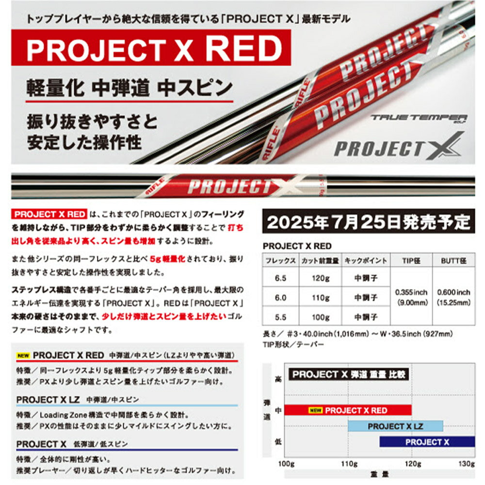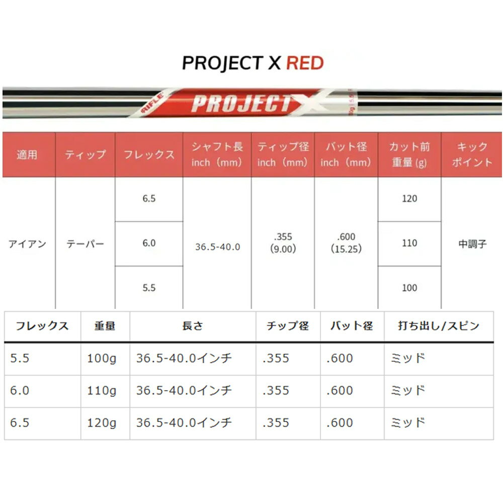 トゥルーテンパー様よりPROJECT X RED発売! 従来のPROJECT X よりも少し弾道とスピン量を上げたいゴルファー向けのシャフトです。 PROJECT X REDは、これまでの「PROJECT X」のフィーリングを維持しながら、TIP部分をわずかに柔らかく調整することで打ち出し角を従来品より高く、スピン量も増加するように設計。 ●共通スペック 長さ36.5-40.0(番手別設計)/元調子/チップ径.355/バット径.600 ●重量(カット前) 5.5:100 6.0:110 6.5:120 ※価格は1本単価となります。複数本数購入の場合、必要な番手を選択していただき、その合計本数をご購入ください。 ※リシャフトをご希望の場合、別途グリップと工賃を本数分ご購入ください。トゥルーテンパー様よりPROJECT X RED発売! 従来のPROJECT X よりも少し弾道とスピン量を上げたいゴルファー向けのシャフトです。 PROJECT X REDは、これまでの「PROJECT X」のフィーリングを維持しながら、TIP部分をわずかに柔らかく調整することで打ち出し角を従来品より高く、スピン量も増加するように設計。 ●共通スペック 長さ36.5-40.0(番手別設計)/元調子/チップ径.355/バット径.600 ●重量(カット前) 5.5:100 6.0:110 6.5:120 ※価格は1本単価となります。複数本数購入の場合、必要な番手を選択していただき、その合計本数をご購入ください。 ※リシャフトをご希望の場合、別途グリップと工賃を本数分ご購入ください。
