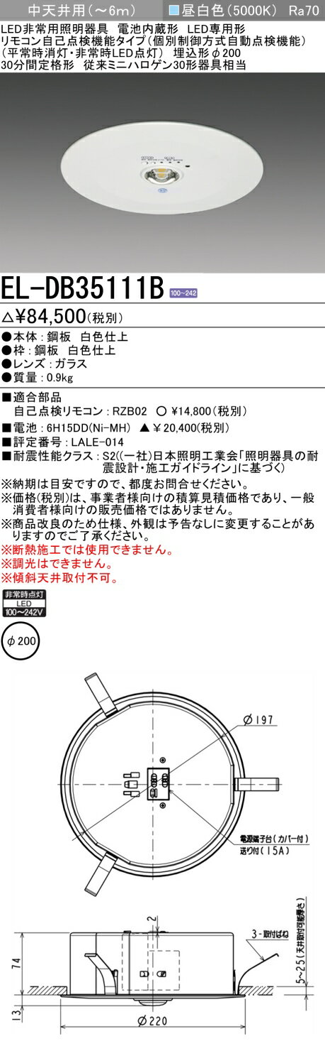 ◆電圧:100~242 V ◆消費電力:1 W ◆【レンズ】ガラス ◆【カバー】鋼板(クールホワイトつや消し仕上) ◆【蓄電池】ニッケル水素蓄電池 ◆点検スイッチ付 ◆充電モニタ(緑)付 ◆自己点検スイッチ付 ◆天井埋込型、埋込穴φ100、30分間タイプ・LED低天井用(~3m) ◆Ra70 ◆非常灯評定番号:LALE-004 【交換電池】FK706 【リモコン】FSK90910K (別売) ◆●水平天井取付専用 ◆※消費電力は100V時の数値です。 ◆配光番号:K0143780