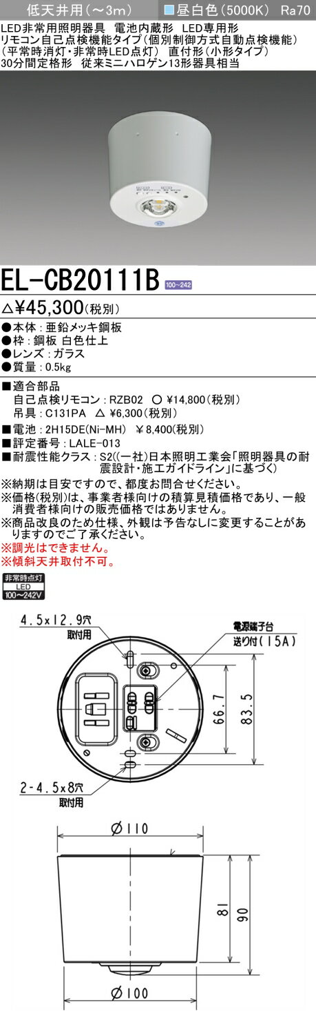 ◆電圧:100~242 V ◆消費電力:1 W ◆【レンズ】ガラス ◆【カバー】鋼板(クールホワイトつや消し仕上) ◆【蓄電池】ニッケル水素蓄電池 ◆点検スイッチ付 ◆充電モニタ(緑)付 ◆自己点検スイッチ付 ◆天井埋込型、埋込穴φ150、30分間タイプ・LED低天井用(~3m) ◆Ra70 ◆非常灯評定番号:LALE-004 【交換電池】FK706 【リモコン】FSK90910K (別売) ◆●水平天井取付専用 ◆※消費電力は100V時の数値です。 ◆配光番号:K0143780