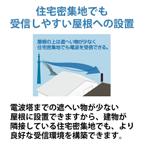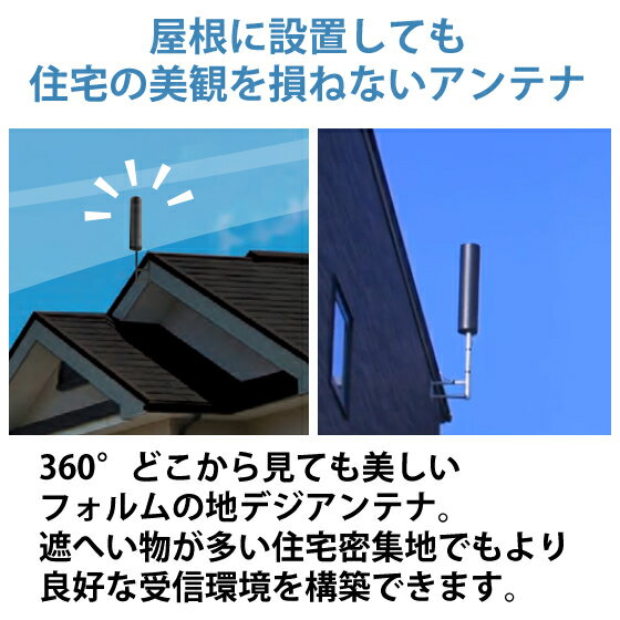 マスプロ セール 地デジアンテナ ポール型UHFアンテナ 水平偏波用 ダークカラーの外壁に 強・中電界地域用 シンプルフォルム ポール型アンテナ ユニコーンアンテナ デザインアンテナ おしゃれ グッドデザイン賞AV機器>テレビ>アンテナ関連品地上デジタル (地デジ) 放送用 UHFアンテナUNICORN(ユニコーン) ブラックブロンズ MASPRO (マスプロ)屋根に設置しても住宅の美観を損ねないシンプルフォルムのUHFアンテナ 「UNICORN(ユニコーン)」。MASPRO (マスプロ)商品コード(JAN・EAN・UPC):4978877242440メーカー型番:U2CN(BB)U2CNBB ★カラー選択 20素子アンテナ相当 ホワイト ブラックブロンズ ベージュ ブラック ★カラー選択 20素子アンテナ相当(ブースター内蔵型) ホワイト ブラックブロンズ ベージュ ★カラー選択 26素子アンテナ相当 ホワイト ブラックブロンズ ベージュ ブラック ★カラー選択 26素子アンテナ相当(ブースター内蔵型) ホワイト ブラックブロンズ ベージュ ★カラー選択 垂直偏波用(UNICORN) ウォームホワイト ブラックブロンズ ★BSアンテナ 右左旋円偏波対応 ホワイト ブラック ★その他マスプロの製品 製品一覧はこちら <特長>●シンプルなポール形状で反射の少ないマットな質感は、360°どこから見ても住宅のデザインへ溶込み、美観を損ねません。●電波塔までの遮へい物が少ない屋根に設置できますから、建物が隣接している住宅密集地でも、より良好な受信環境を構築できます。●独自技術により実現した直径約14cmのポール形状は、風の影響を受けにくく、また、太陽光パネルにかかるアンテナの影も最小限に抑えられますから、屋根への設置に最適です。一本のマストで衛星アンテナと併せての設置もできます。●遮へい物が少ない屋根に設置することで、壁面に設置した20素子相応のスカイウォーリーと同等の受信結果が得られるよう設計しています。●外観がスッキリ見えるよう、マスト固定金具を隠せる樹脂カバーを備えています。また、ボルト2本だけでマストに固定でき、施工性に優れます。●無鉛はんだの採用、カドミウム・水銀などの不使用により、EU(欧州連合)の有害物質使用規制(RoHS指令)に適合しています。●水平偏波。●屋外用。<仕様>◆受信チャンネル:ch.13〜52◆動作利得(感度):5.5〜6.2dB(実力値)◆適合マスト径:φ25〜39mm◆外観寸法(WxDxH):143x123x672mm(突起部を除く)◆質量:約1.5kg◆付属品:F型コネクター(5Cケーブル用)x1、防水キャップx1◆カラー:ブラックブロンズ屋根に設置しても住宅の美観を損ねないシンプルフォルムのUHFアンテナ 「UNICORN(ユニコーン)」。