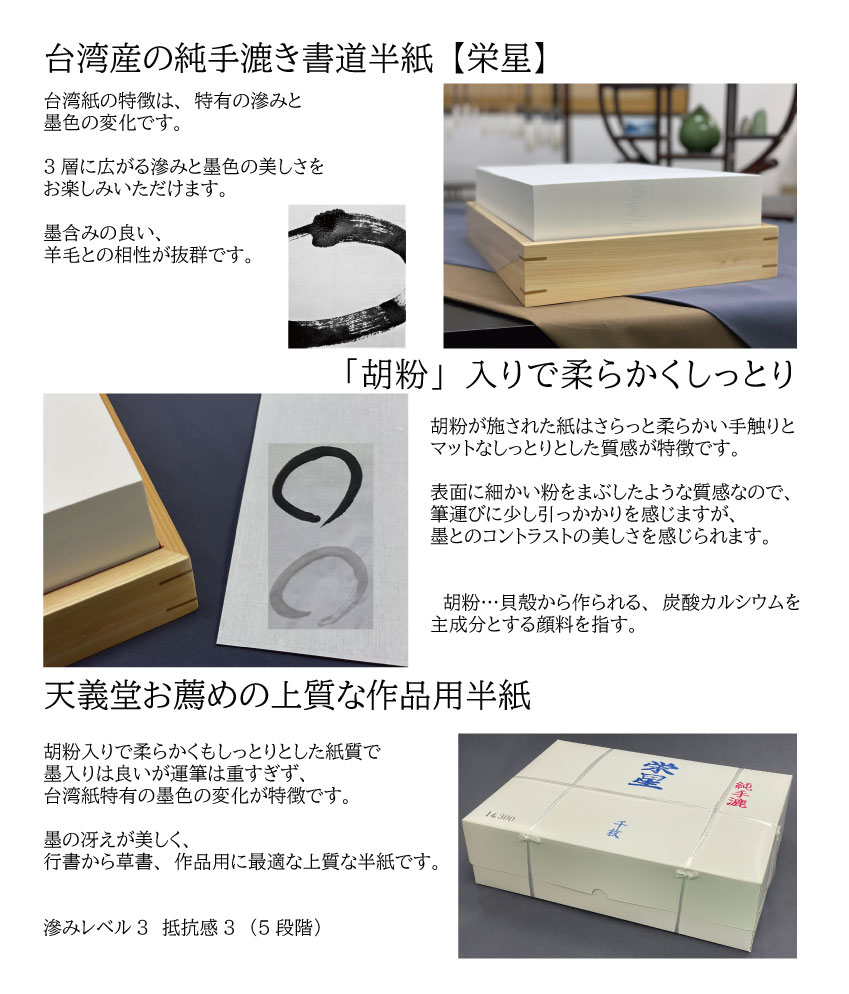 天義堂 書道半紙 漢字 手漉き【 半紙 栄星 1000枚 】 書道 習字 初心者 練習用 清書用 臨書 書きやすい 滲み少なめ 画仙紙 習字 教室 学校 学生 大人 胡粉入 台湾産系 滲み美麗 書道 習字 半紙1000枚 手漉き 清書用 大人 程よい滲み 胡粉入り 台湾紙系特有の質感を持つ上質な手漉き画仙紙です。墨の入りが良く、筆運びは軽やかでありながら、しっかりとした手応えがあります。胡粉入りの柔らかな紙質が特徴で、墨含みの良い羊毛筆との相性も抜群です。独特な滲みと墨色の変化が生み出す深みのある表現が楽しめ、特に行書や草書に最適です。適度な滲みと美しい墨の冴えが、作品に奥行きと気品を加えます。3層にわたる滲みと色の移ろいを堪能できる、こだわりの紙をお試しください。特徴・台湾紙系特有の滲みと墨色の変化・胡粉入りで柔らかくも、しっかりした紙質・墨の入りが良く、筆運びの重さを軽減・行書や草書に最適な仕上がり胡粉入りで柔らかくもしっとりとした紙質‼墨入りは良いが運筆は重すぎず、台湾紙系特有の滲みと独特な墨色の変化が特徴です。墨の冴えが美しく、行書や草書に最適な上質の作品用画仙紙です。最近では珍しくなってきています「台湾紙系」を一度試してみてはいかがでしょうか。 2
