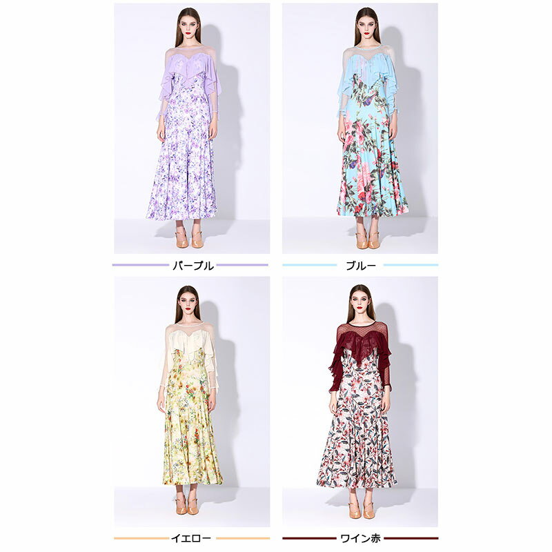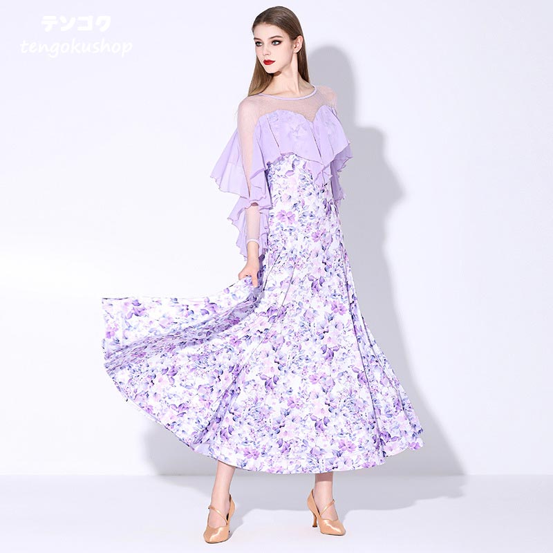 モダンドレス パープル 団体ウエア 社交ダンス ラテンドレス レッスン着 花柄 イエロー ブルー ワインレッド ダンス練習着 競技会 ワルツ 演出 モダンダンス ドレス ボールルーム衣装 スタンダード ワルツダンス服 広がる裾 ワンピース 送料無料 S M L LL 3L