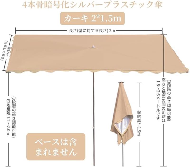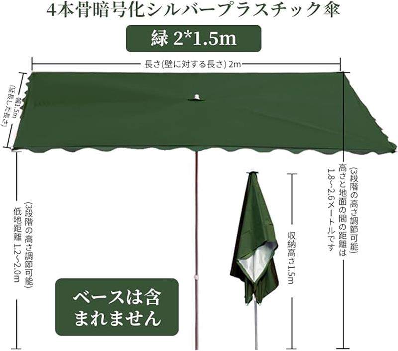 【丈夫で耐久性】当社の長方形のパラソルは、上部が傾斜したユニークなデザインを採用しており、直射日光をより効果的に遮断し、雨が降ったときに滴る雨水を自動的に滑り落とすことができます。 6本のスチール製傘骨は頑丈な構造で、風雨に耐えることができ、使用中に日傘が簡単に損傷せず、長寿命です。 【強力な防雨・紫外線防止】日よけ傘生地は二層生地で作られており、上層はオックスフォード布、下層は銀接着防水コーティングで、雨と紫外線を遮断し、UPF40+効果で紫外線を効果的に遮断します。光線を照射し、紫外線ダメージから肌を守ります。傘生地と傘立ては別々に設計されており、組み立てが簡単で、傘生地の交換も簡単です。 【持ち運び可能・高さ調節可能】パラソルの開閉はハンドルを採用しており、ハンドルを押すだけで開閉できるので、力の弱い女性でも簡単に大型パラソルの開閉が可能です。 傘のハンドルの高さは3段階に調節可能で、さまざまな場面やユーザーのニーズに合わせて、いつでもパラソルの高さを調節できます。 【幅広い適用範囲】アウトドアパラソルは、モバイルショップ、市場、庭園、テラス、公園、キャンプなどの機会に幅広く使用でき、さまざまな色とスタイルから選択できるため、ユニークな屋外空間に簡単にマッチし、追加することができます。あなたの暮らしに洗練とエレガンスを。 [重要な注意事項 - この製品にはベースが含まれていません]。 傘の寿命を延ばすために、雷雨や強風の前に傘を締めることをお勧めします。