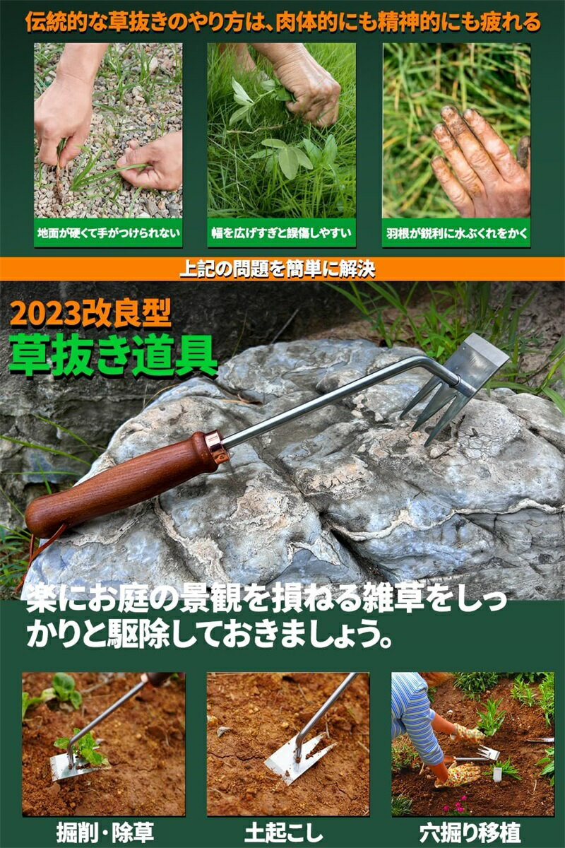 草取り 道具 根こそぎ 草抜き ステンレス製 除草ツール 雑草抜き 頑丈 丈夫 便利 雑草取り器具 片手鍬 雑草防止 庭 菜園鍬 草削鍬 園芸用 土起こし器 草抜き器具 木製ハンドル