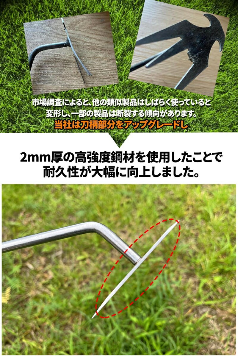 雑草を根こそぎ抜くだけでなく、ピンポイントで雑草を抜き取れます。使い方はとても簡単で、3本の尖った歯を土に差し込み、根が溝の底にできるだけ近づくようにし、ハンドルを引いて雑草を引き抜く 草取り道具の刃部は厚くて鋭利、細かい雑草や狭い隅の雑草を取り除きやすくなっています。草抜き 道具だけでなく、土壌表面をほぐして水はけを良くし、土壌の通気性を高めます。非常に使いやすく効率的です 高品質ステンレス製で、丈夫で耐久性があり、長時間使用しても錆びたり変形したりしないので、使用中に刃や歯が傷む心配がありません。使用後に残った雑草や汚れを簡単に掃除できるよう、表面を研磨しています 人間工学に基づいており、手の形状に合わせて作られているため、より遠くまで届き、疲労を軽減して草取りをすることができます。ハンドルの上部には穴が開いており、細い紐が付いていますので、場所を取らずに必要な場所に吊るすことができます。